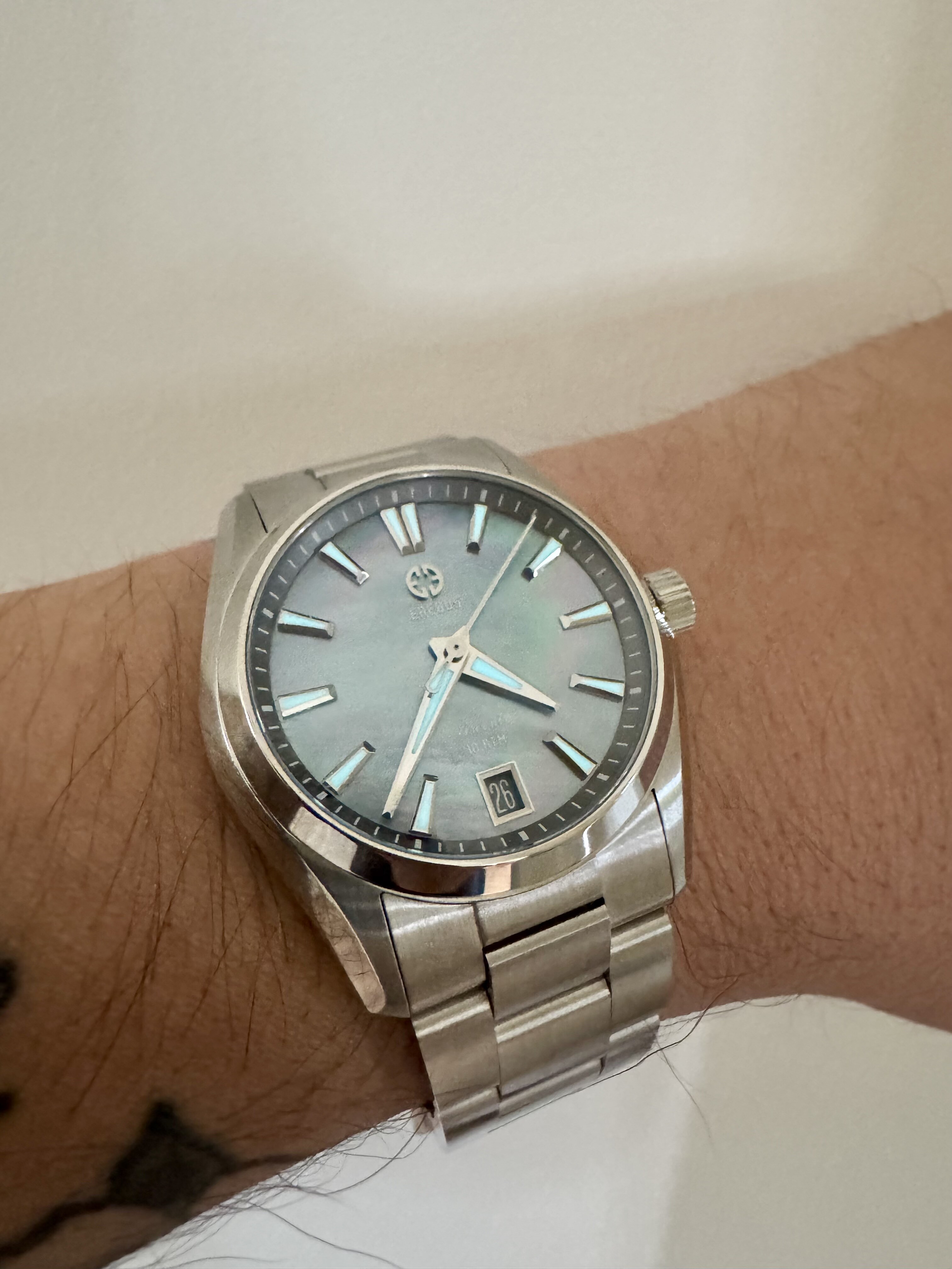 Hij ziet er juist klein uit om de pols tov andere 36mm horloges. Dit komt denk ik doordat de wijzerplaat wat kleiner is door de ‘rehaut’ met de minuut markeringen.