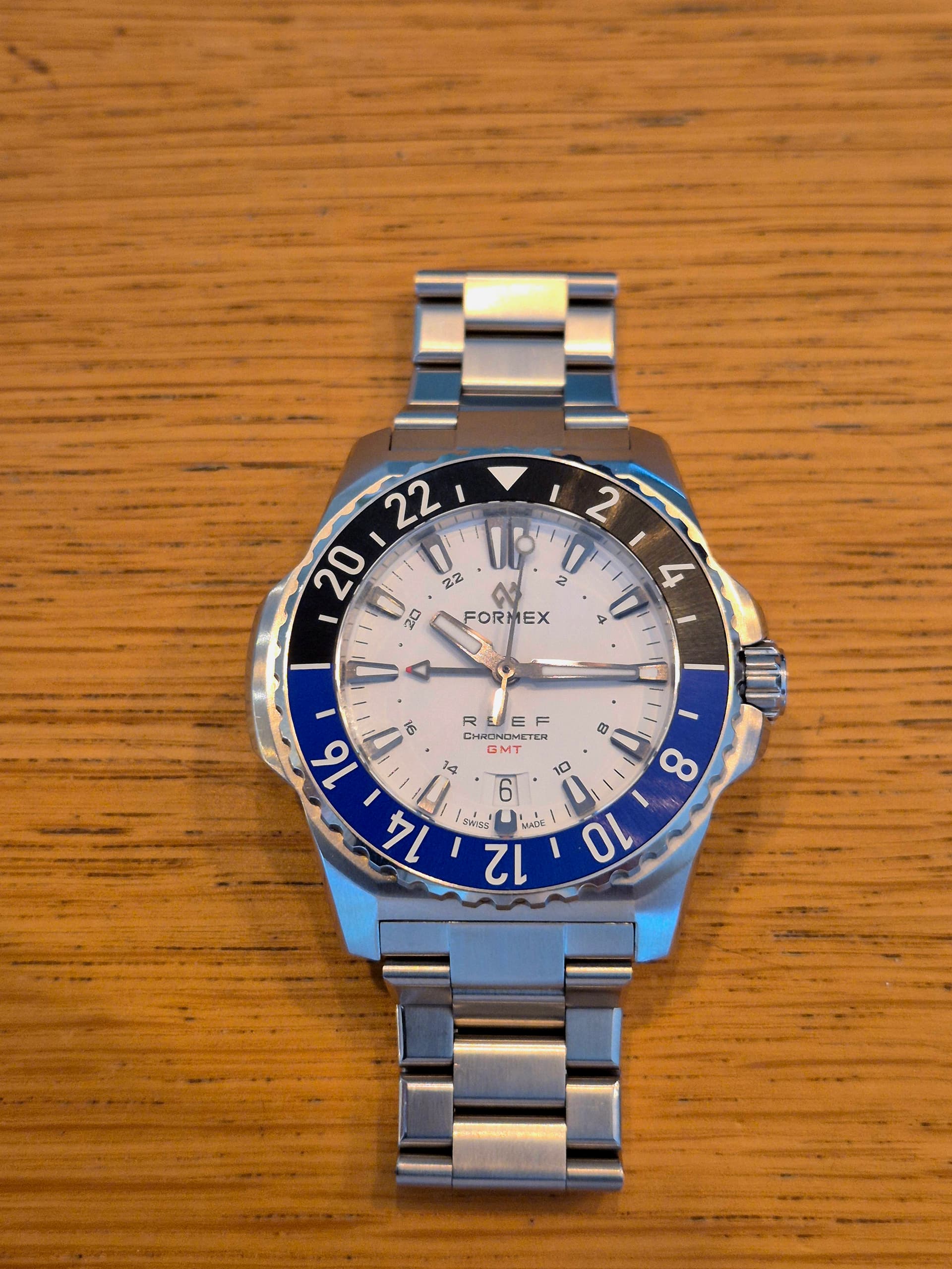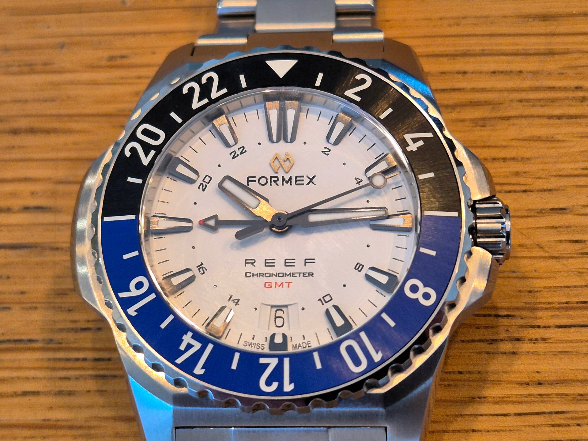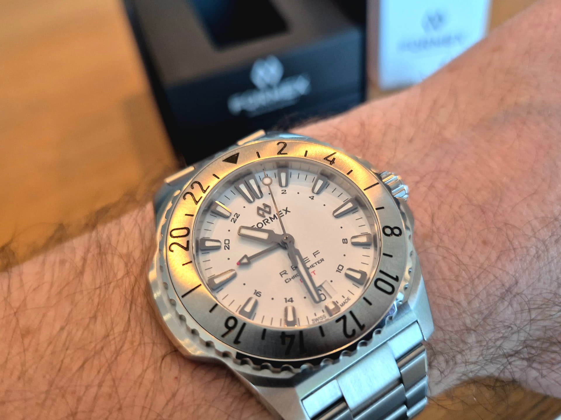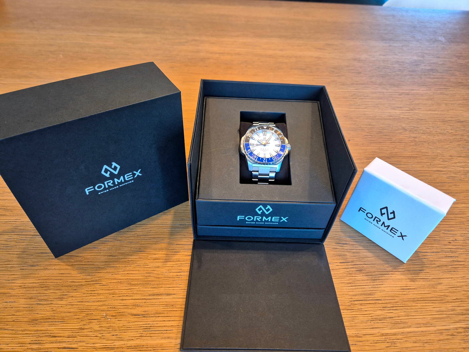 Mijn keuze voor Formex was zowel ingegeven door hun brutale en uitgesproken uiterlijk, de eigenschappen, de specs en ook de prijs kwaliteit verhouding. Meermaals tijdens mijn zoektocht heb ik mogen lezen en horen (bv Mike van This Watch, That Watch en andere reviewers) dat Formex in de prijsklasse van 1500 - 3000 prijs kwaliteit gewoon heel top zijn. Dus veel waard voor je geld denk je dan. En zeker als je de eerste waardedip kunt vermijden met een jongkoop. En dus mocht ik gisteren mooi deze Formex Reef GMT aanschouwen.