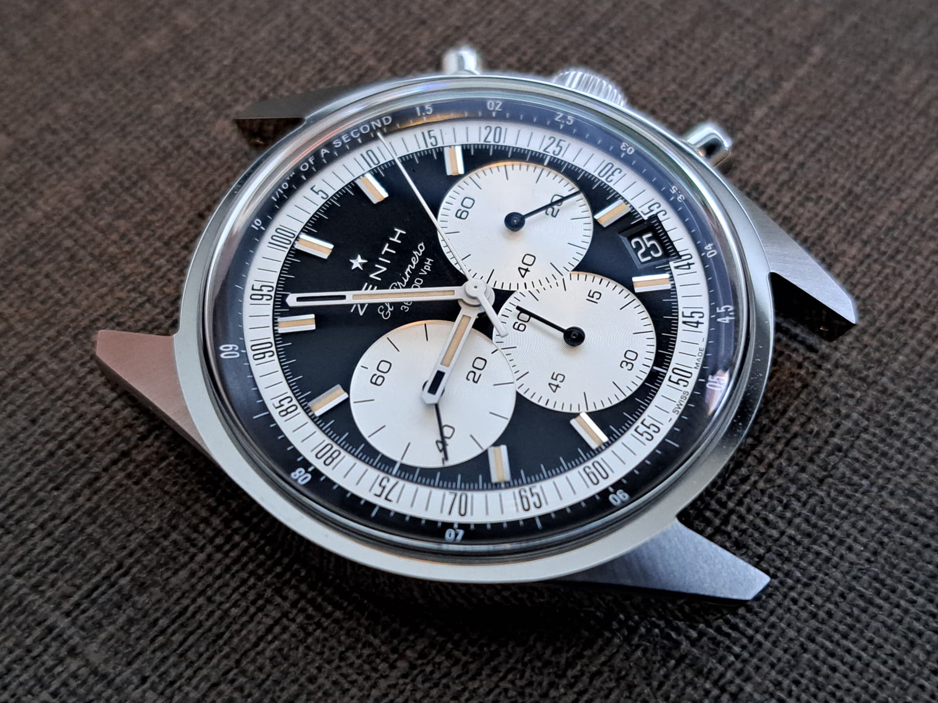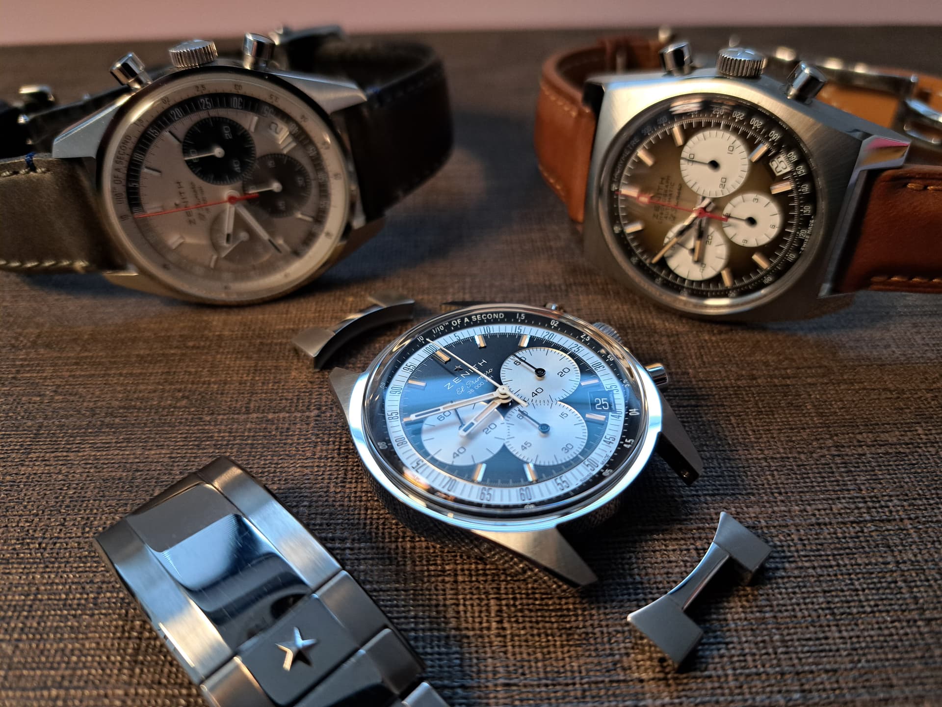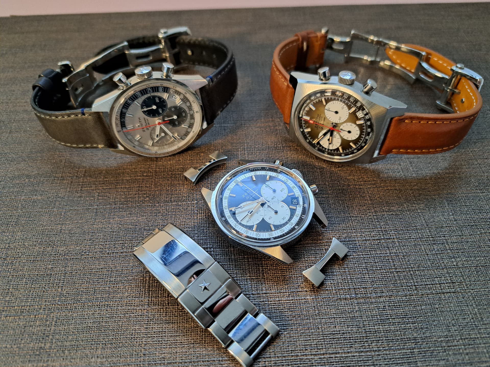 Omdat ik thuis nog een stalen band liggen had, zocht ik de versie met lederen band (met zo’n heerlijke vlindersluiting), maar de bedoeling is om hem in de zomer vooral op staal te dragen. Lekkere Miami Vice vibe op deze manier! Nu vond ik een betere aanbieding op een exemplaar met stalen band, dus wat winterbanden en een sluiting zal nog moeten verzamelen. Ik mik op iets bleek (golden yellow) en een zwarte in buffelleder. Als iemand een 16mm Zenith vlindersluiting wil slijten, stuur maar een PB.