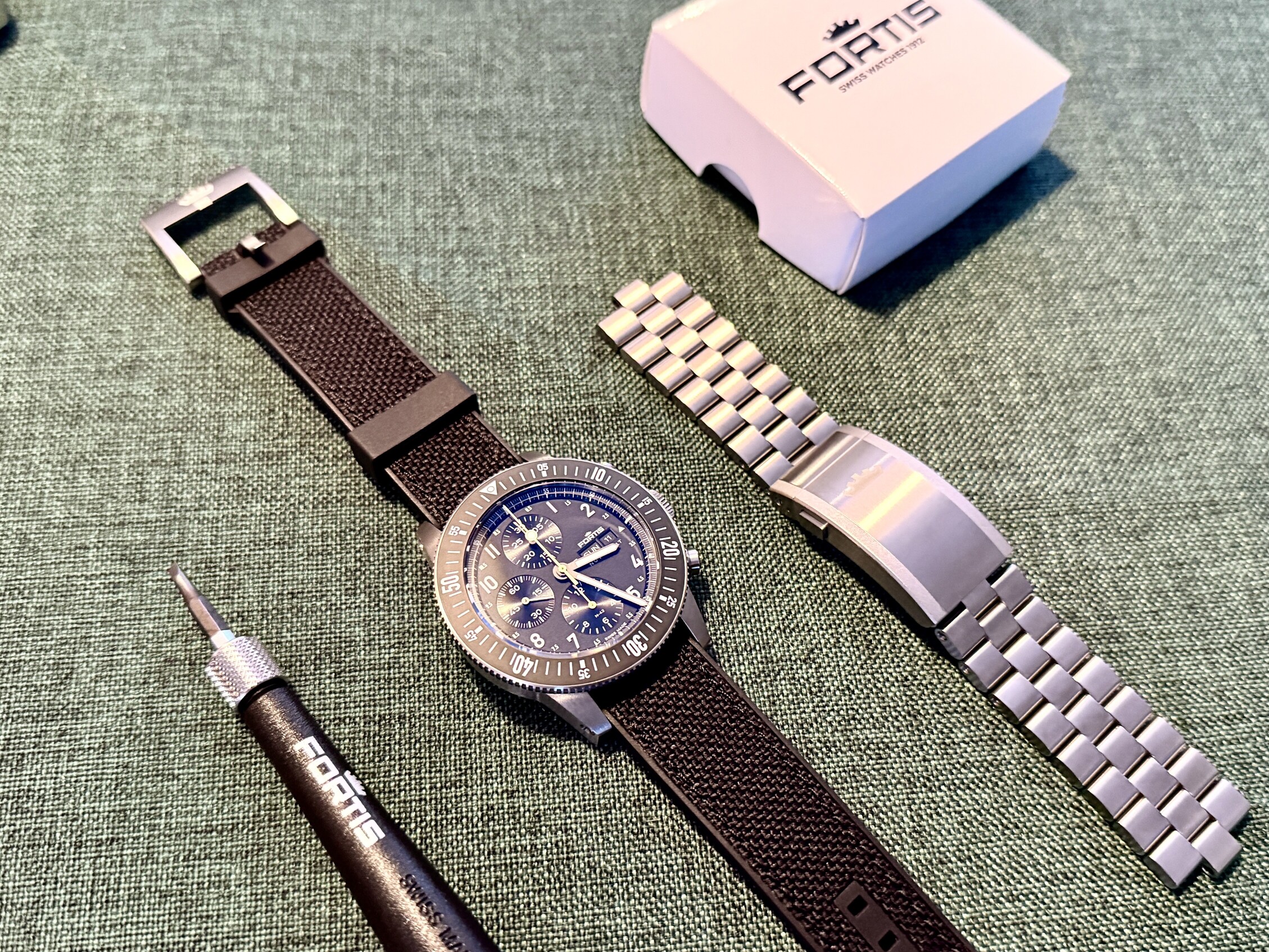 Het horloge heeft geen springbars maar stalen pins die je in de kast schroeft, dit kon ik makkelijk zelf met de meegeleverde Swiss tool Fortis schroevendraaier.