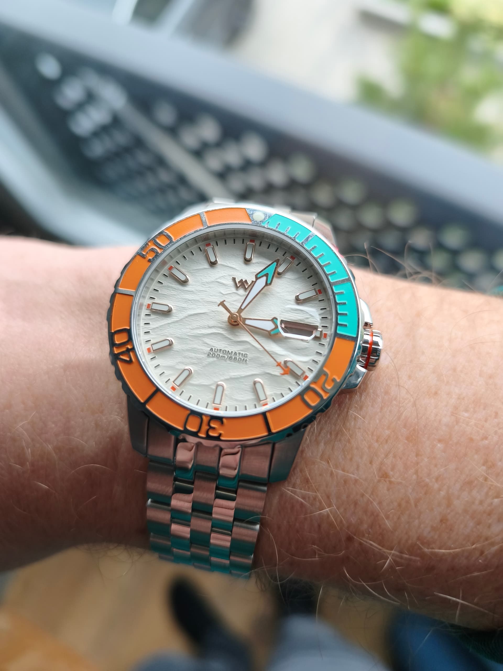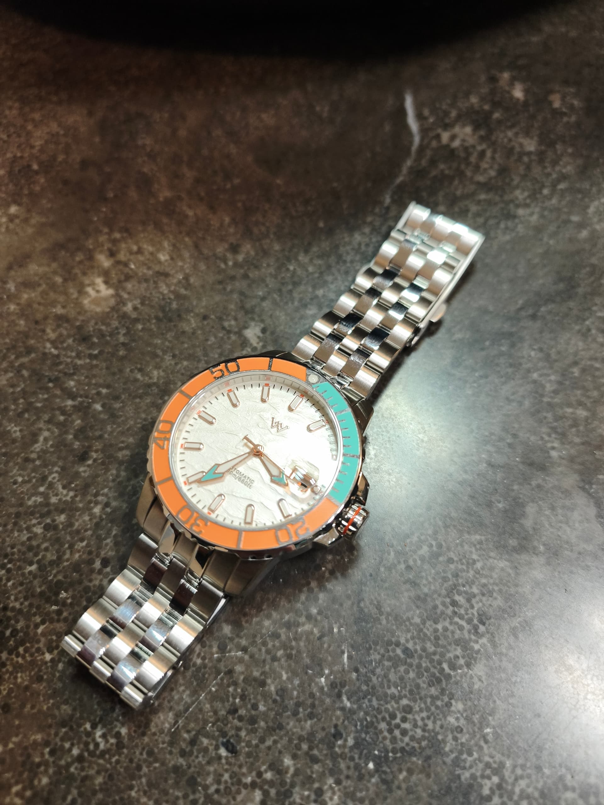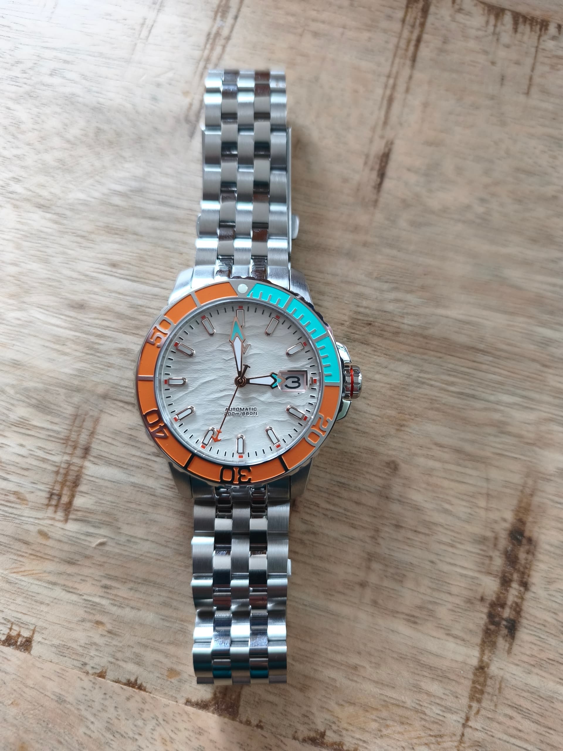 Indrukwekkende kwaliteit voor de prijs met een super mooie bezel en een wijzerplaat met reliëf een zogeheten 3D olie gedrukte wijzerplaat? Ik had er nog niet van gehoord maar het is zeker mooi
