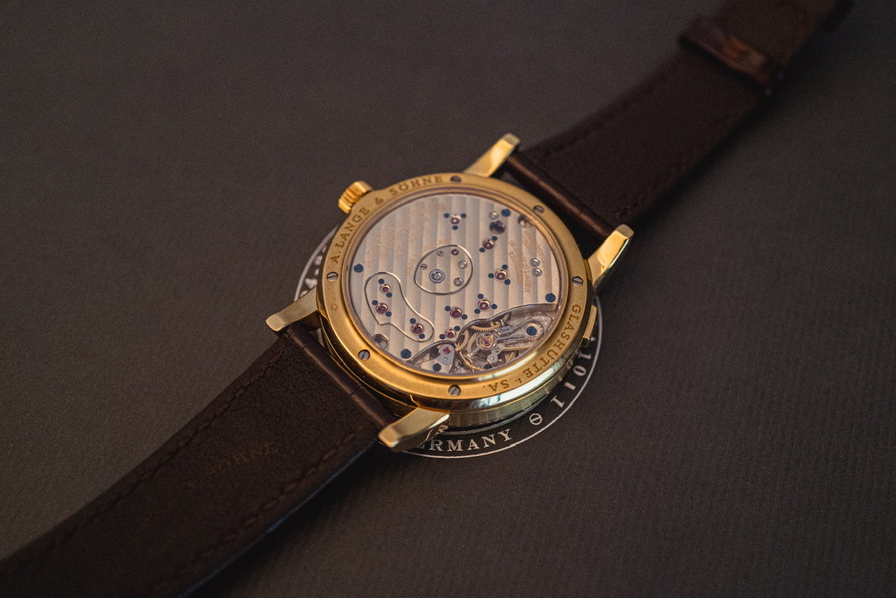 De 3/4 base plate met de Glashütte stripes zijn oogstrelend