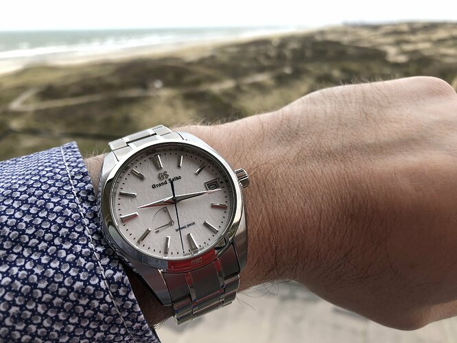 Ondanks de drukte werden we prima geholpen. De eerste kennismaking met een GS in het echt is toch wel bijzonder. De details die je op internet kent van macro foto’s zijn in het echt zo verfijnd, zo klein. Gelukkig voelde de GS zich gelijk thuis op mijn 17,5cm pols, de lugs volgen de pols prachtig. Ondanks dat wel nog even een stalen GS Hi-beat GMT en een Omega Aqua Terra gepast. De Hi-Beat is prachtig, maar een stuk dikker om de pols (en zwaarder). De Aqua Terra beviel ook goed, maar naast de Sneeuwvlok was de keuze snel gemaakt. Twee schakels uit de band, en hij zat als gegoten.