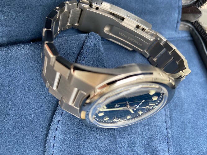 De lugs buigen mooi naar beneden en sluiten zo mooi aan op de ronding van de pols. Het saffier heeft vervorming aan de randen, maar dit heeft geen invloed op de leesbaarheid door het geweldige ontwerp van de wijzerplaat. Die wijzerplaat heeft hele sexy opgelegde indices met een mooie lume.