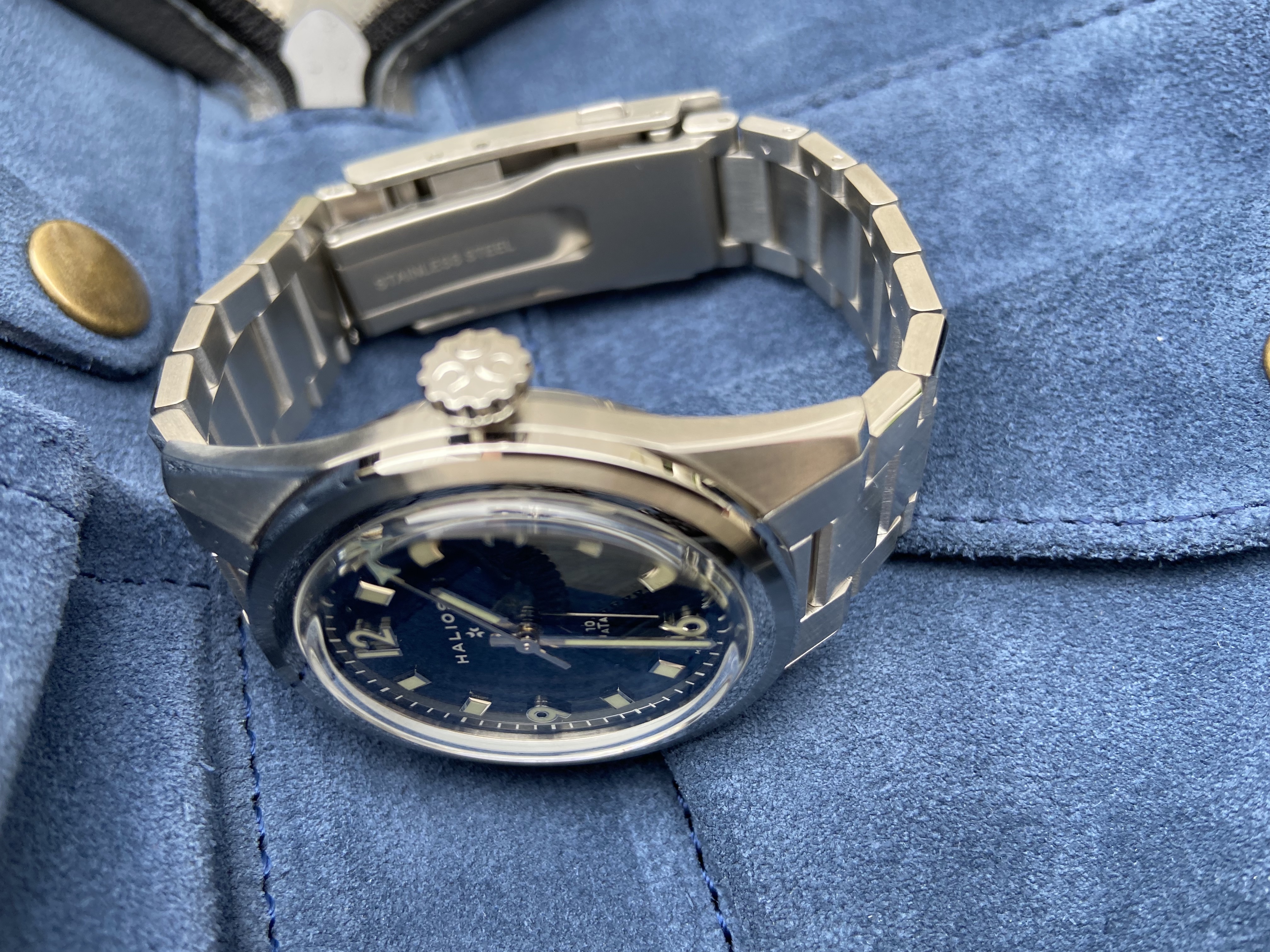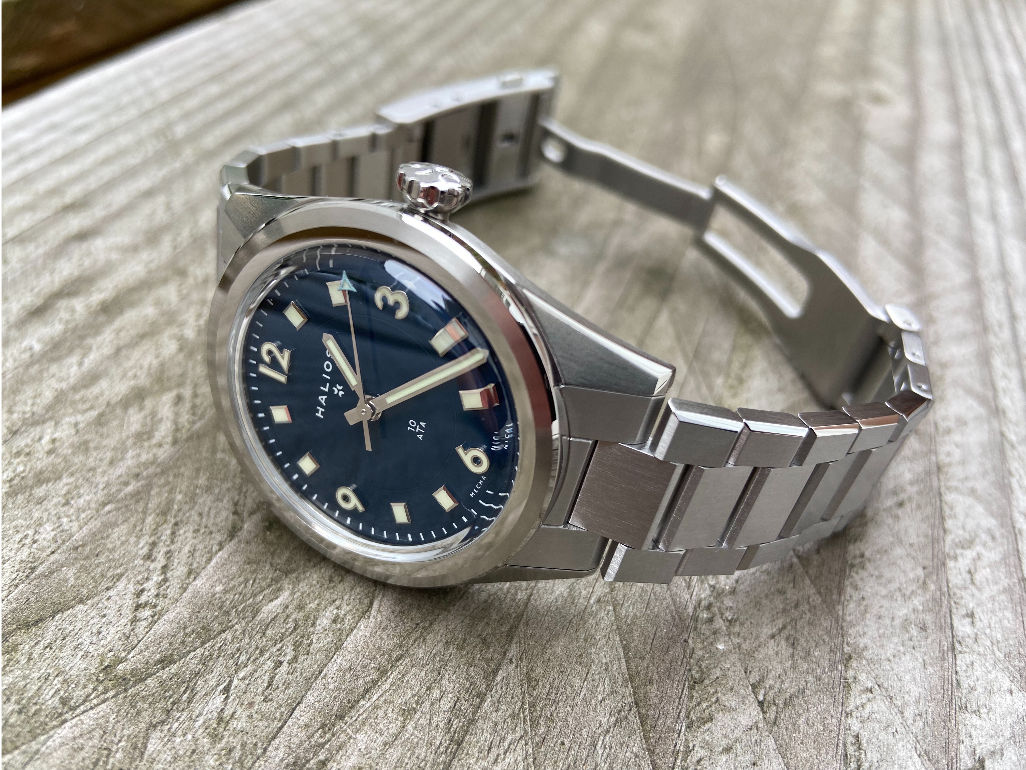De gesigneerde kroon heeft een beetje een flieger stijl en is hierdoor goed te draaien om op te winden of uit te trekken om de tijd in te stellen. Dat opwinden is nieuw voor mij, het is mijn eerste handopwinder, maar er zit een goede instructie bij van Halios die verteld hoe dit het beste gedaan kan worden. “Stop bij weerstand”