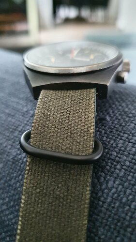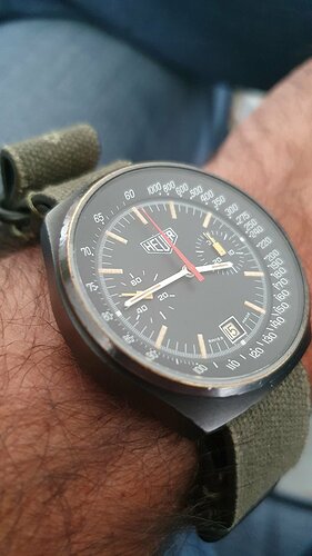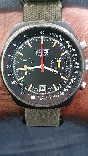 Een horloge van deze leeftijd toont natuurlijk ‘tekenen van leven’, maar de slijtage die ik op de zwarte coating zie, lijken wel zo bedoeld. Een heerlijke en stoere patina-look.