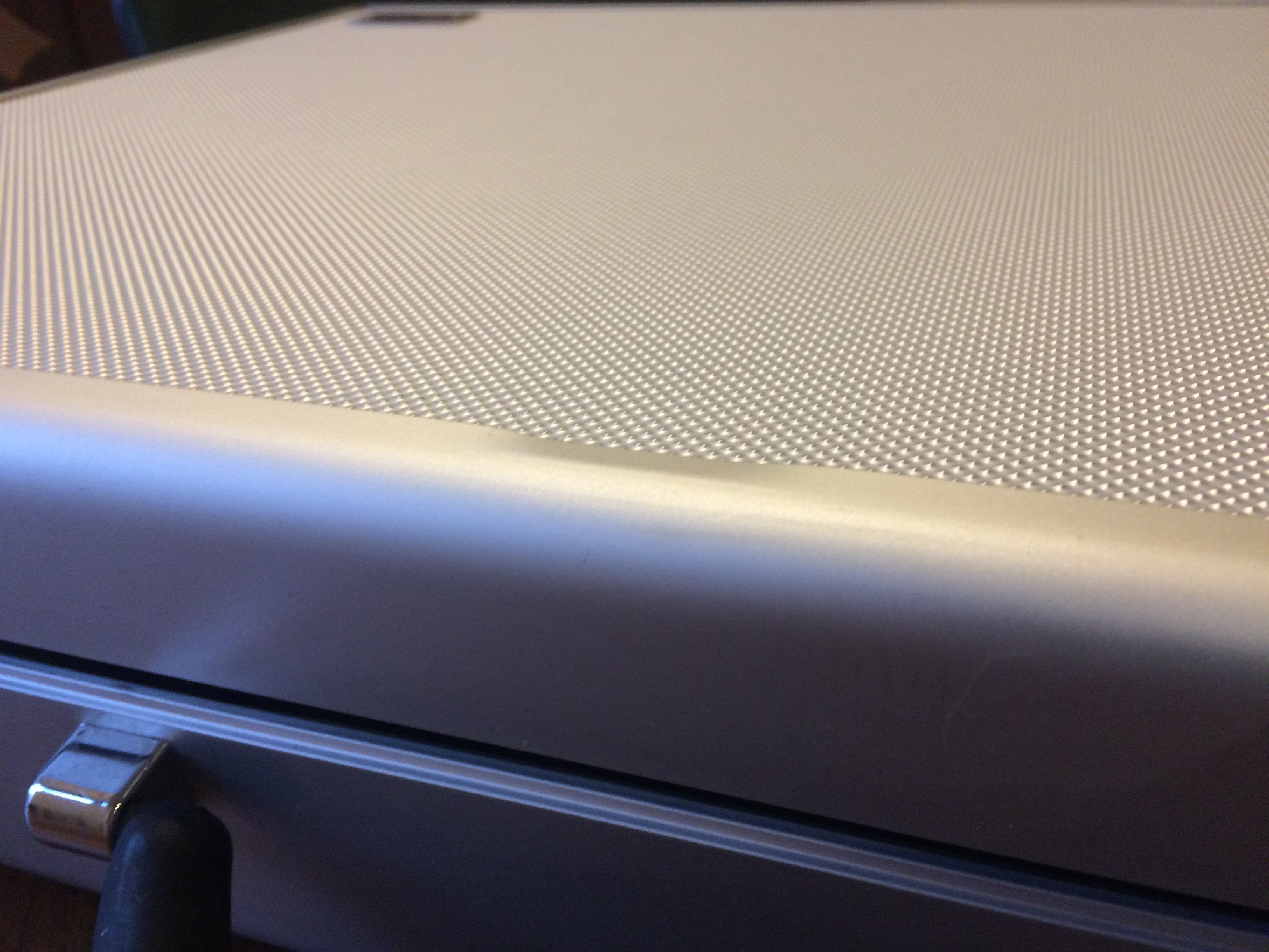 Ik word gelijk begroet door de deuk op onderstaande foto. Het ding heeft ergens een tik gehad. Kan gebeuren. Ik kan hier bovendien op zich wel mee leven, want het zal niet lang duren voordat ik zelf zo’n deuk veroorzaak. Maar toch, het nieuwe-doosgevoel is er gelijk wel een beetje af.