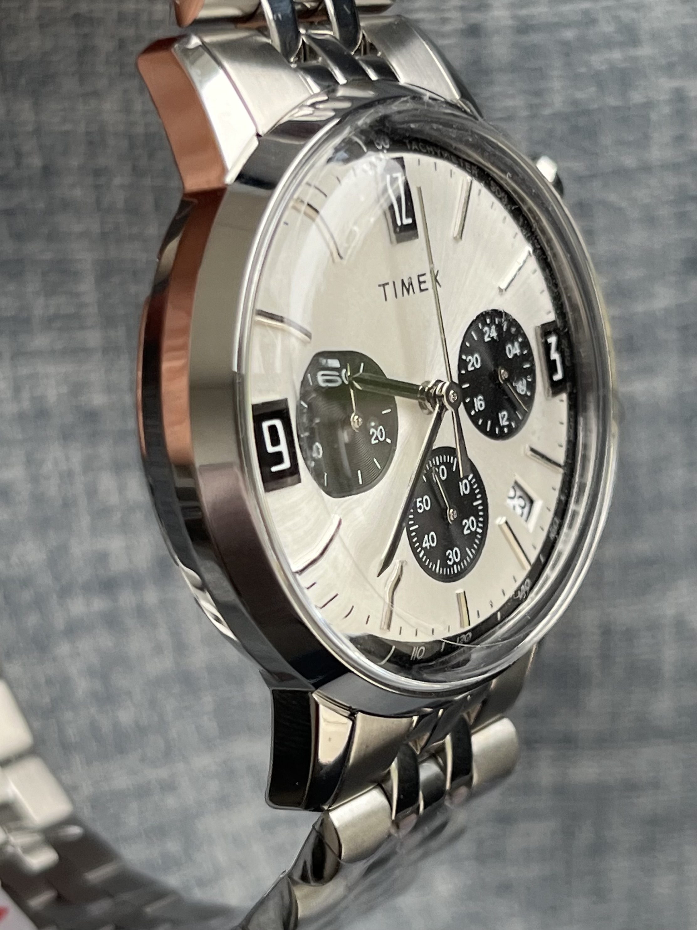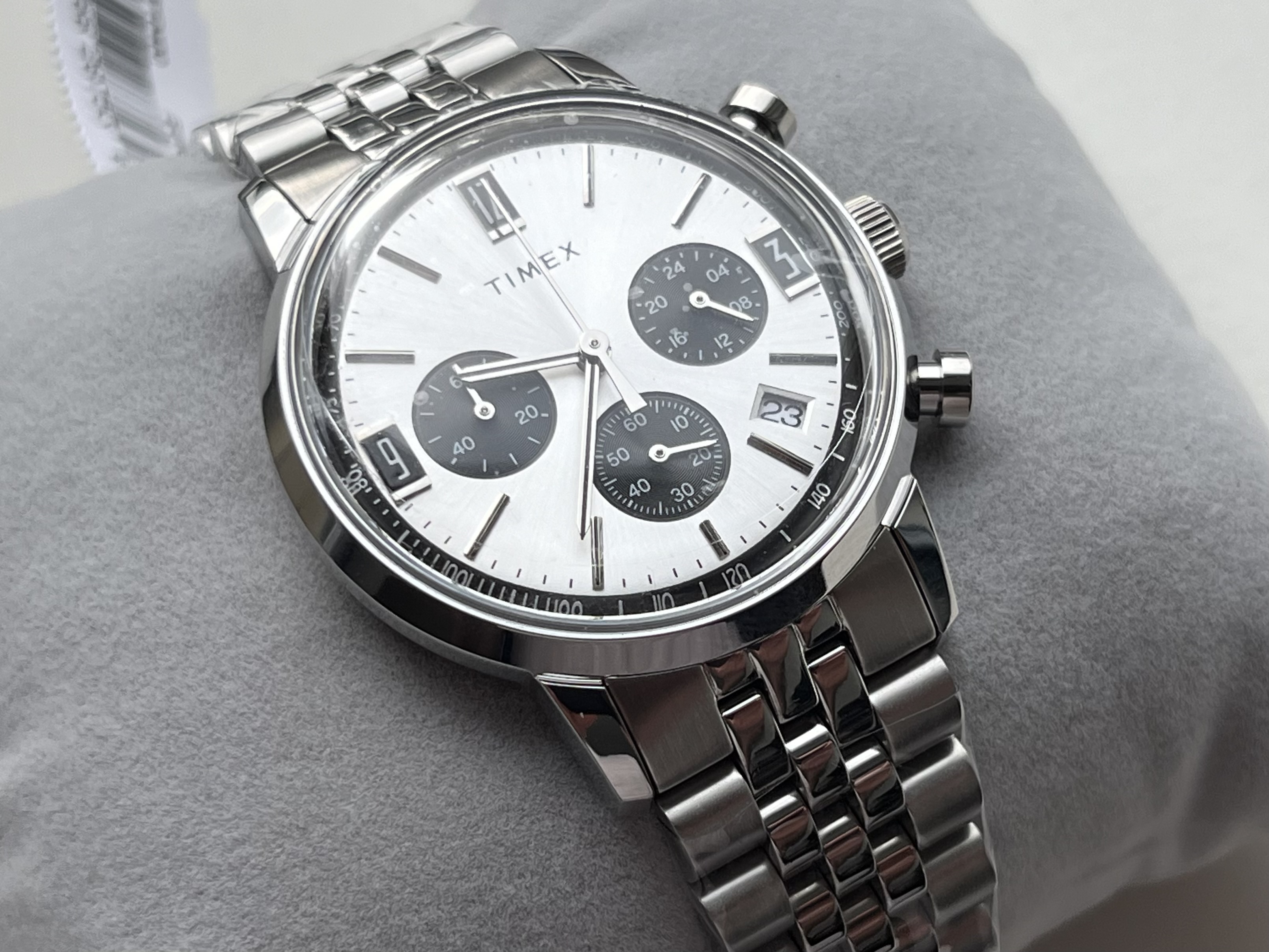 De afmetingen prima (40mm), de looks ook; een lichte dial met donkere subdials, een panda dus. Een datumvenster tussen drie en vier uur, daar kan ik echter heel slecht tegen. Maar het ergste is nog wel die zinloze 24-u subdial. Zo zonde van de beschikbare ruimte op de wijzerplaat. Helaas is die 24u-subdial onvermijdelijk bij de Seiko mechaquartz uurwerken.
