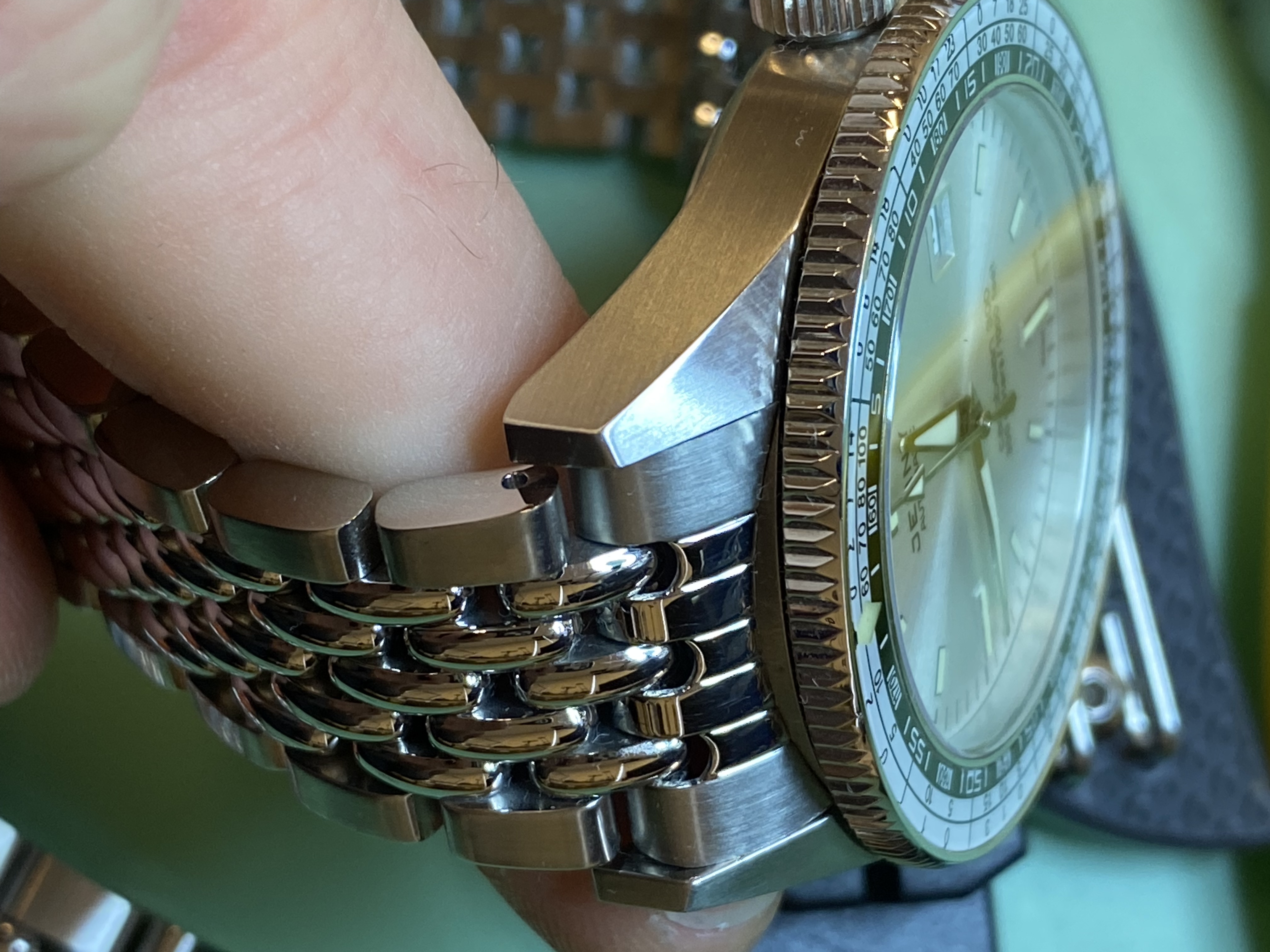 De originele BOR band was niet meer te krijgen dus ik heb er een via Geckota weten te vinden. 21 mm zelfs! Echter de rechte aansluiting vind ik niks. Voor 5 dollar wat losse 22mm endlinks besteld en met de slijpsteen een mm eraf geslepen. Mooi klusje voor de donderdagmiddag. Ik ben er blij mee en hij past mooi bij zijn oranje Doxa broertje!