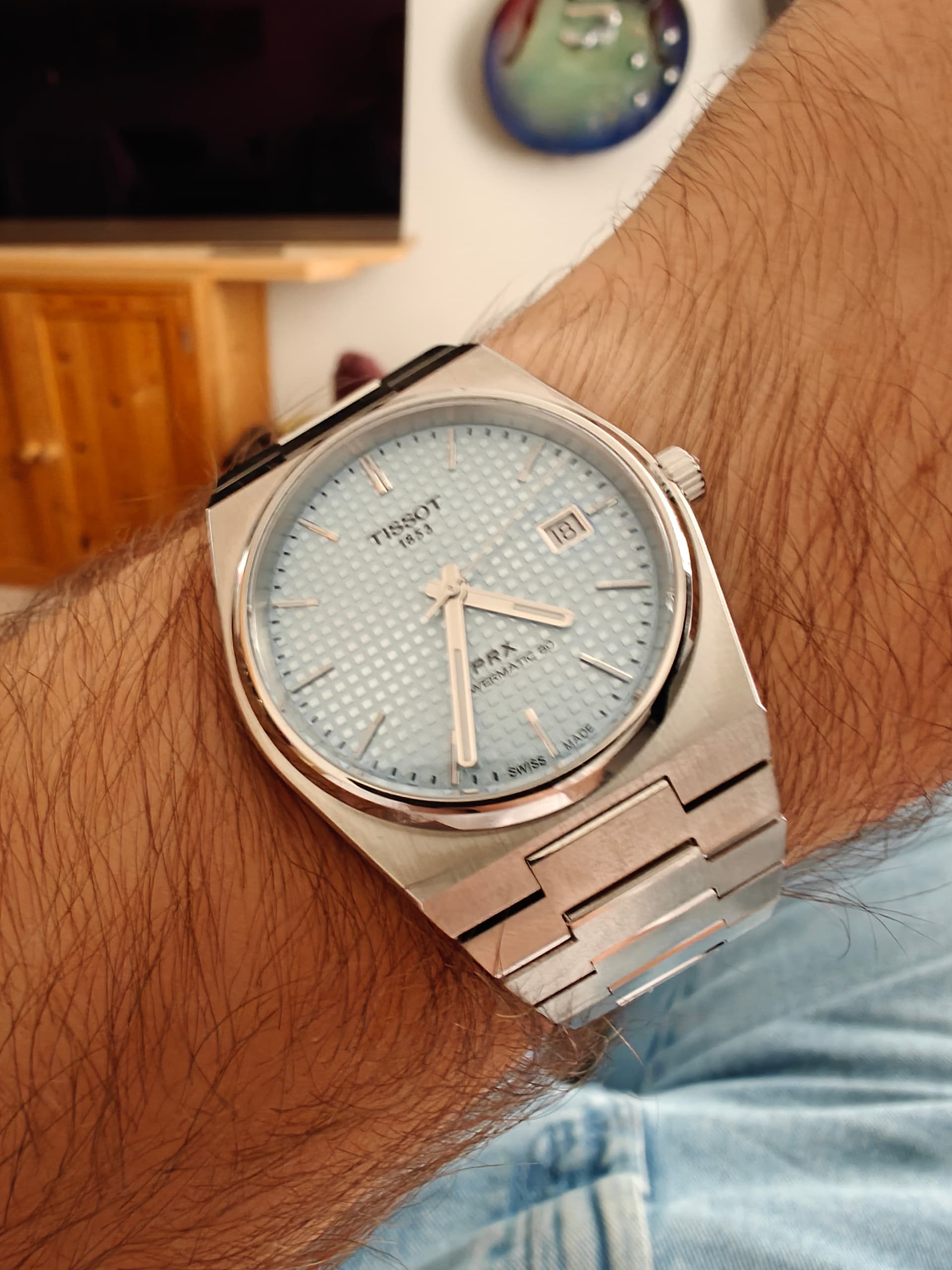 De zoektocht kon dus weer heropend worden, dit keer naar een nieuw horloge met een vintage uitstraling (zodat ik zeker weet dat alles klopt). De welbekende Tissot PRX kwam hierbij natuurlijk ook langs. Vele forumleden gingen mij voor in hun eigenaarschap van dit succesnummer van de Zwitserse gigant. En nu is het voor mij ook zo ver! Ik heb gekozen voor de Powermatic 80 met lichtblauwe wijzerplaat, in de 40mm uitvoering. De foto’s (met telefoon en dopamine, dus wellicht wat onscherp) liegen er niet om…