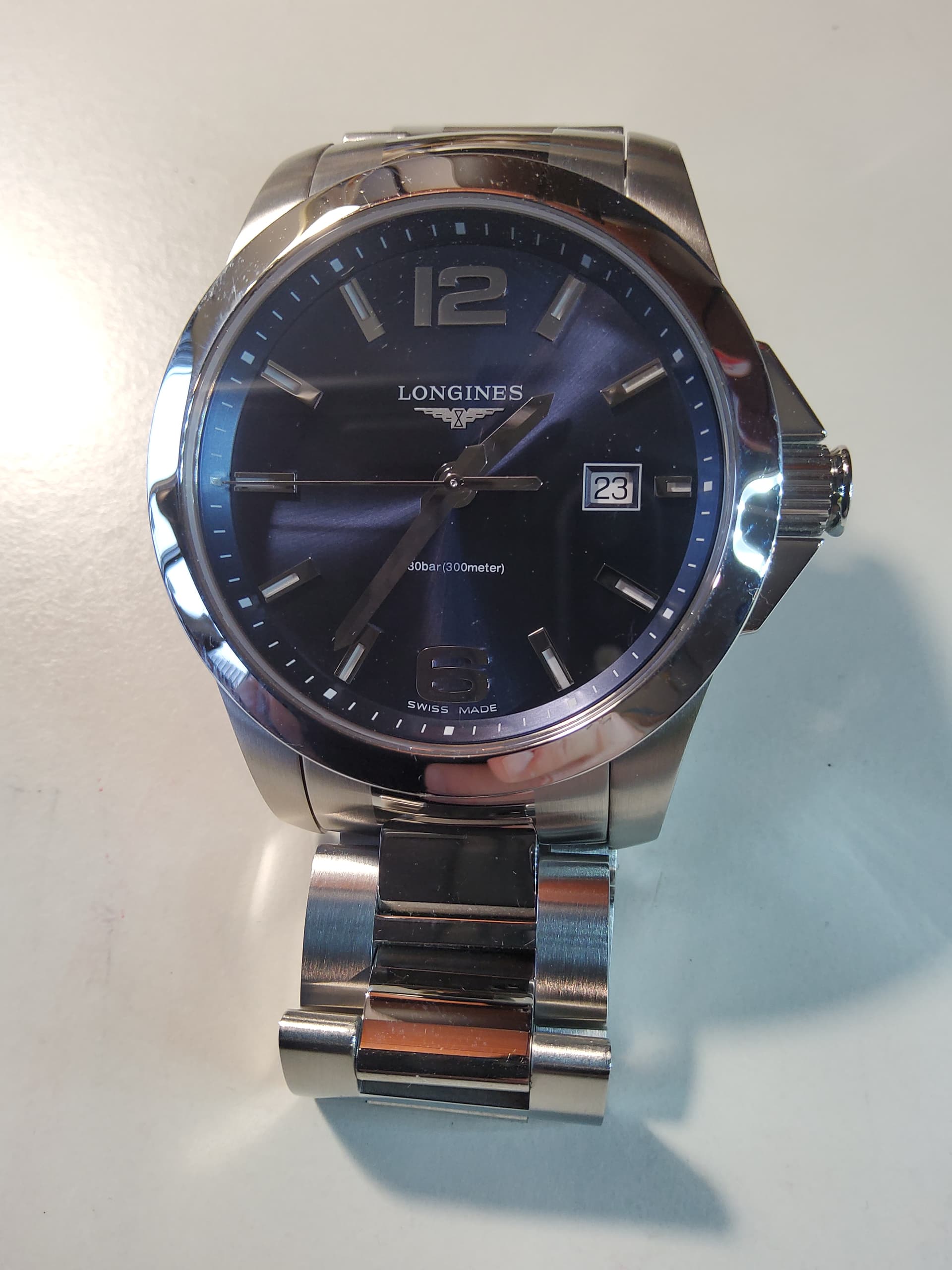 Zie hier mijn Longines Conquest. Al weer een dikke maand in huis en heeft al heel wat polsuren gehad. Ik ben een beetje van mij geloof afgevallen ; het is de quartz versie . Ik moest op Fiumicino een paar uur wachten en daar de winkel van de Swatch groep ingelopen, ik wilde eigenlijk een Hamilton maar de verkoper kwam met deze als alternatief en ik ging voor de bijl hihi. Erg mooie wijzerplaat met die grote cijfers en de band is ook erg mooi met die combi van mat en glanzend staal. Kortom erg blij mee.