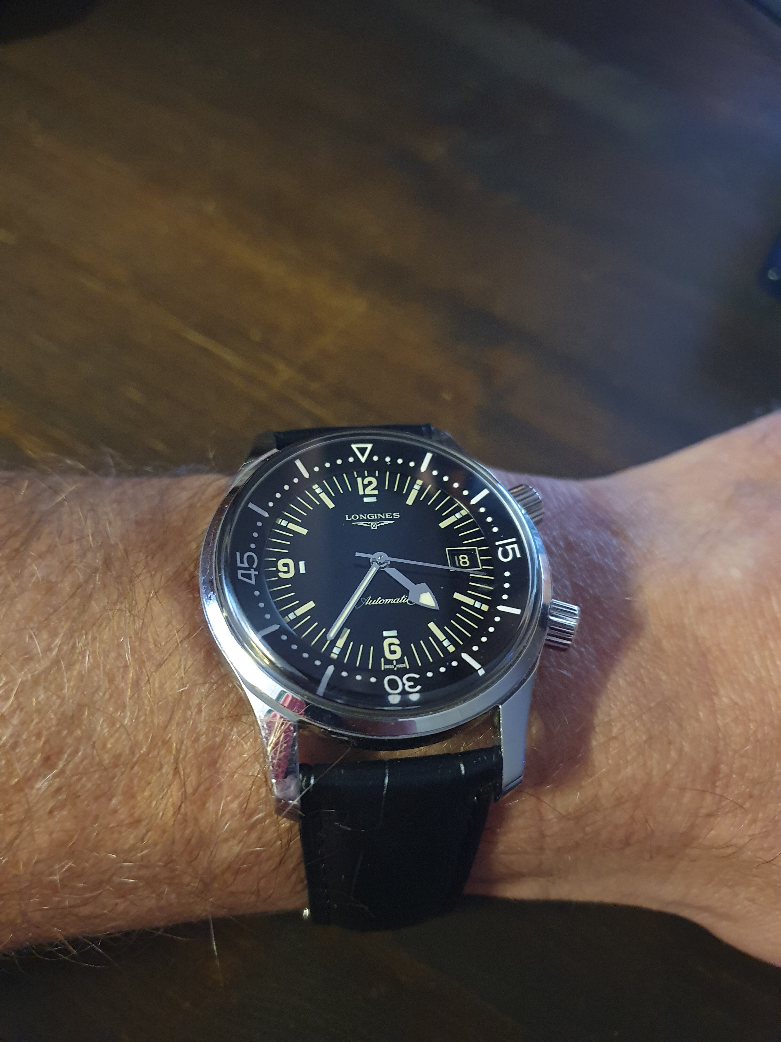 Ooit, toen ik naar mijn eerste vintage horloge zocht na een lange lijst van quartz modellen, zag ik een Longines zakhorloge geconverteerd naar polshorloge. Er mankeerde teveel aan, en met de kennis van nu ben ik blij dat ik een dergelijk horloge niet gekocht heb, maar Longines is denk ik daardoor wel een merk waar ik zo nu en dan met een schuin oog naar kijk. De LLD voldoet heel goed aan het lijstje eisen, al was ik een beetje bezorgd door de berichten van overdreven lange lugs die je hier en daar op internet leest. Bij Wilco was alle twijfel direct verdwenen toen ik de LLD voor het eerst om de pols had. Ja, het is een fors horloge, maar binnen de marges voor wat ik een acceptabele duikermaat vind. De lugs zijn lang, maar de lugholes zitten niet op het eind, maar eerder halverwege, waardoor het horloge mij nog prima om de pols zit.