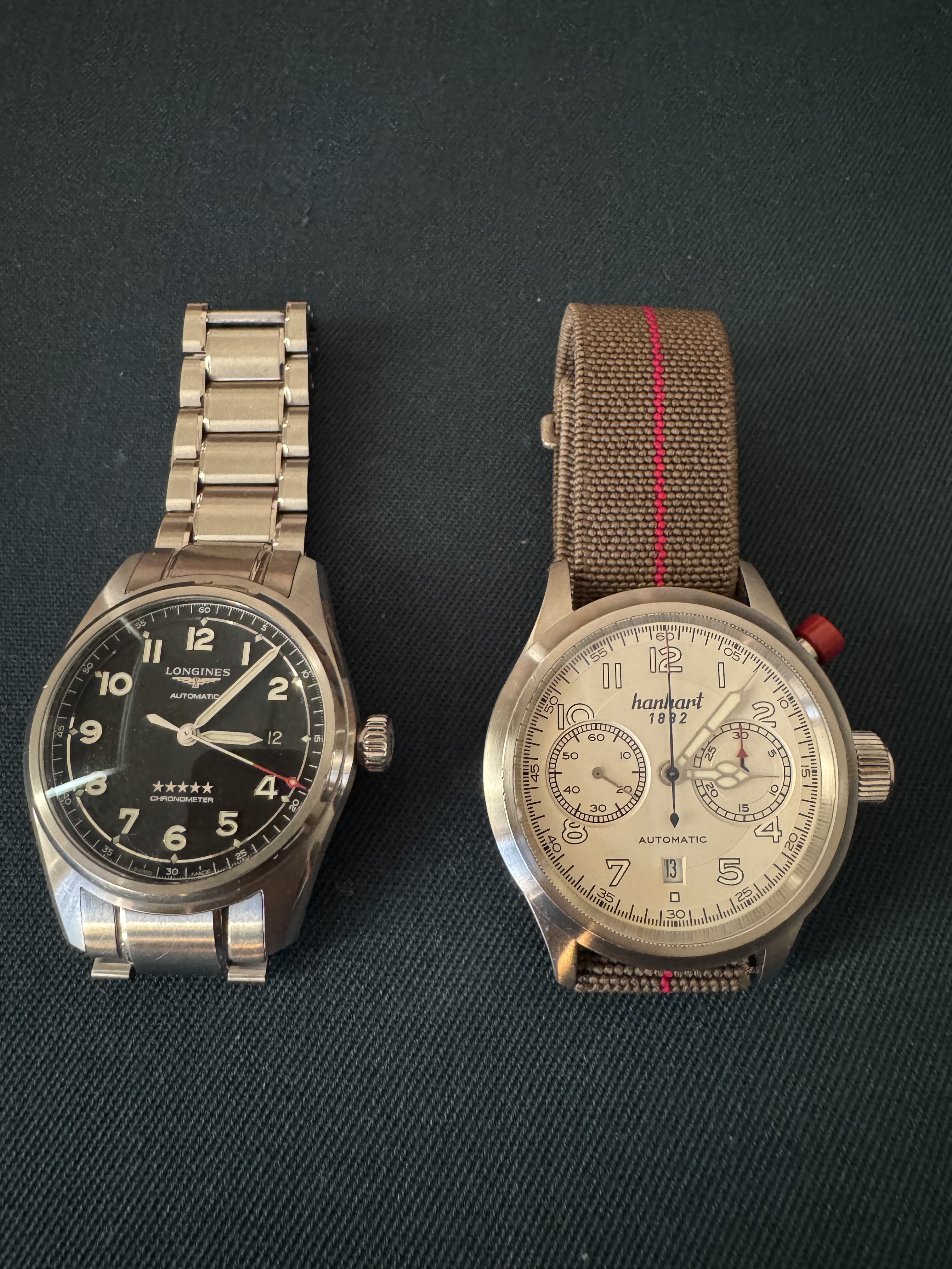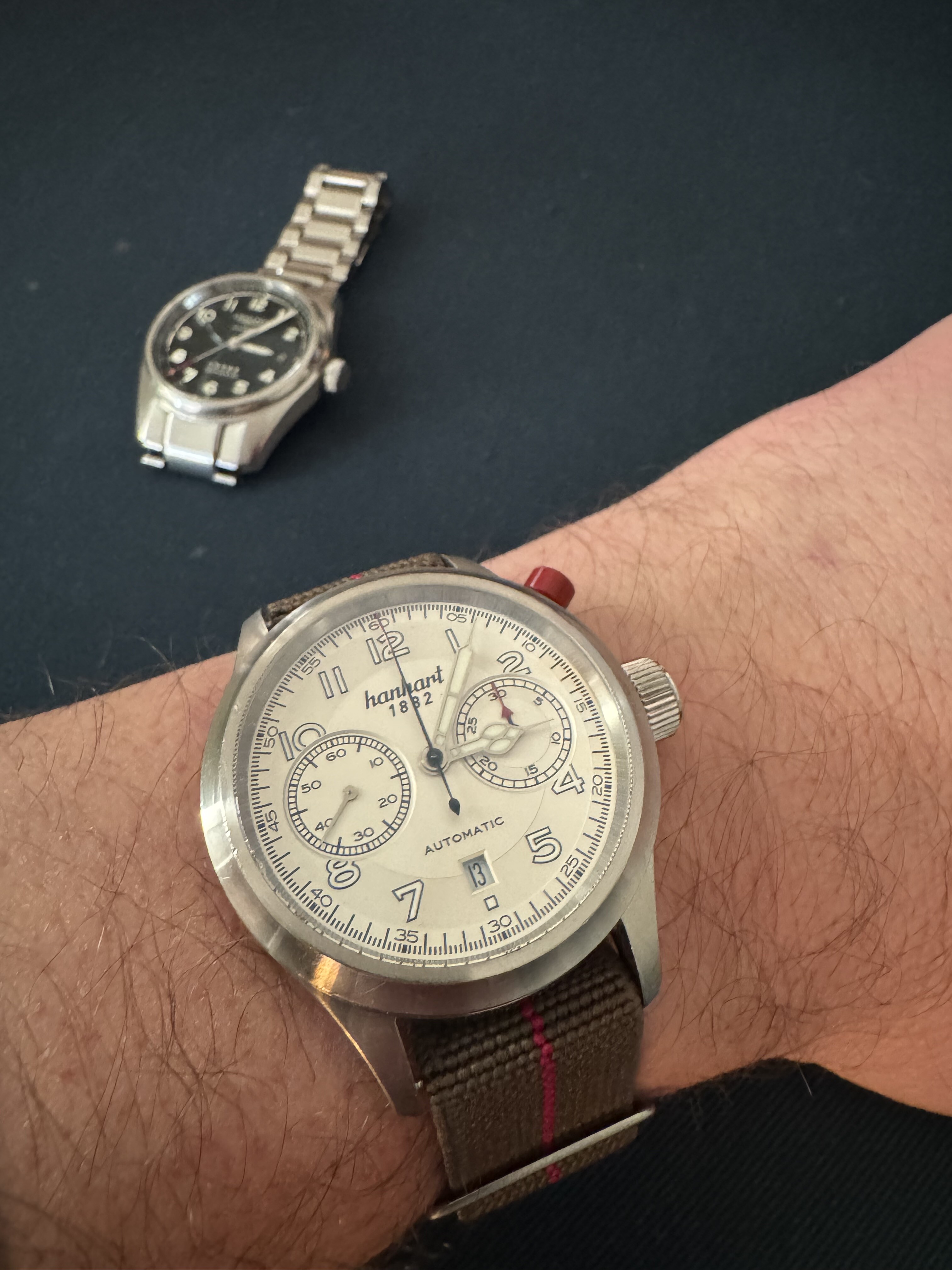 En dan de Hanhart MonoControl: daar ben ik al zo lang verliefd op! Een monopusher van een merk met een mooie historie op het gebied van piloten chronografen. Deze Hanharts zijn relatief schaars en ik wilde er graag één met de lichte wijzerplaat. Bij toeval vond ik deze recent via Marktplaats. Het horloge heeft wat beschadigingen (ook aan het glas), maar daar was de prijs ook naar. Het glas wil ik laten vervangen en ook een service lijkt mij goed om te doen. Verder nog een origineel bandje scoren, maar ik draag hem nu eerst een tijdje om te kijken of het verder allemaal naar behoren functioneert. Net als bij de Longines heb ik constant de neiging om naar het horloge te kijken (en dan niet alleen voor de tijd)