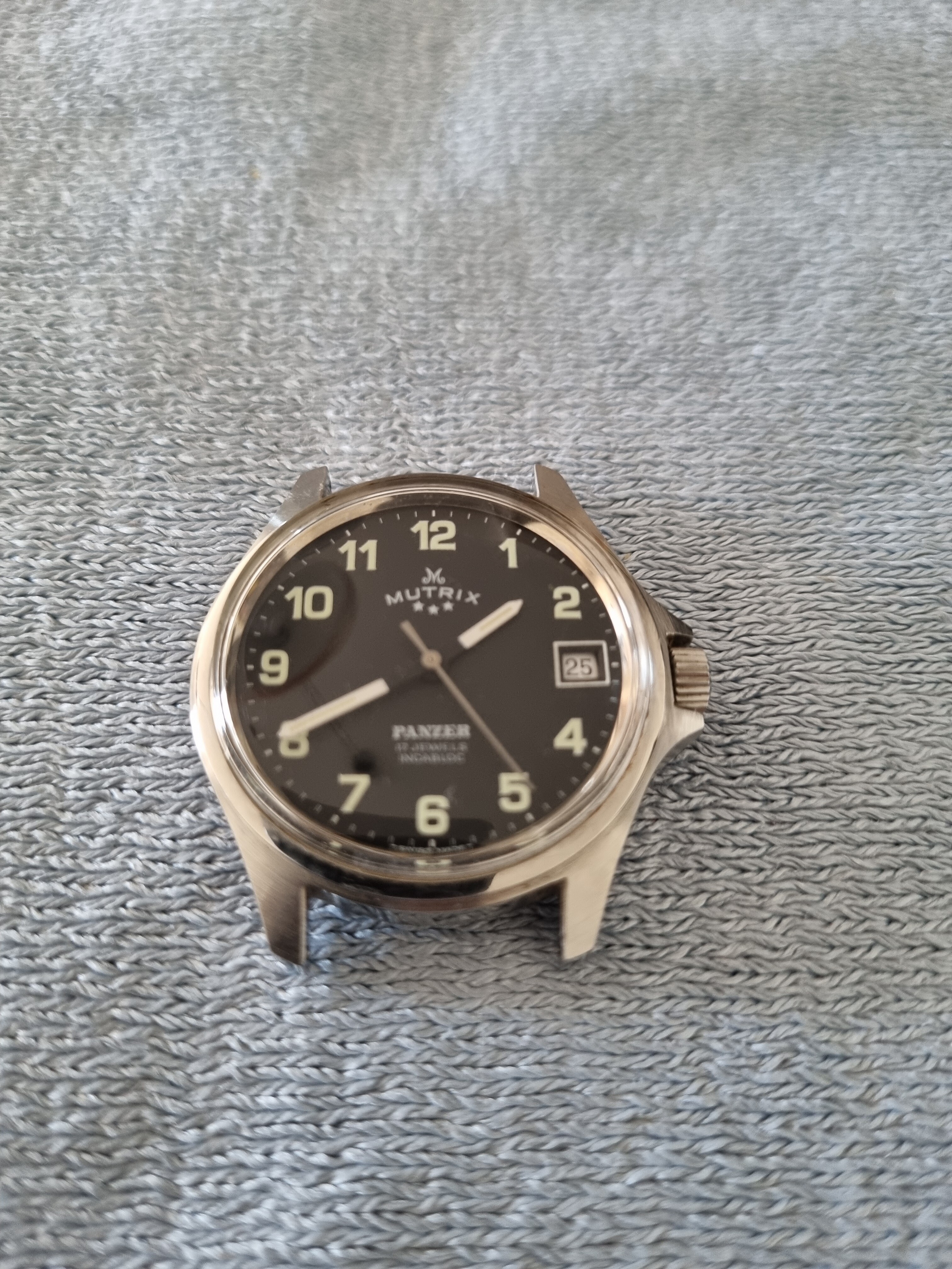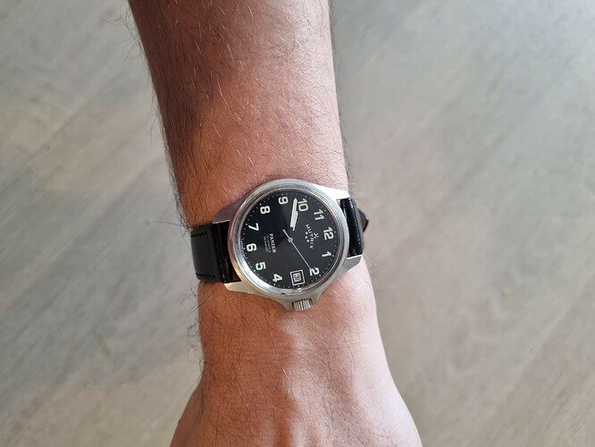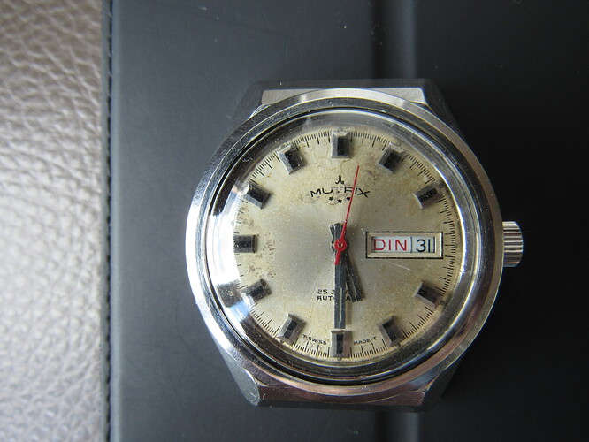 Die zwarte is spectaculair. Mooi, origineel doosje, in nieuwstaat en met papieren! @George920 en ook @Roland1: wat een schitterende horloges zijn dat, die Mutrix Pantzers! @Scudo: die van jou is ook gaaf. Mooie kleur dial. @Roland61. Mooie klassiek wat ouder exemplaar, jammer van de beschadigde dial. Geen courant merk, daar ga je niet snel een vervangende wijzerplaat voor vinden vrees ik. En ‘wijzerplaat afkuisen’ zoals jij dat zo mooi op zijn Vlaams zegt, daar moet je mee oppassen. Bijna altijd is het resultaat teleurstellend en wordt de schade groter dan ie al was.