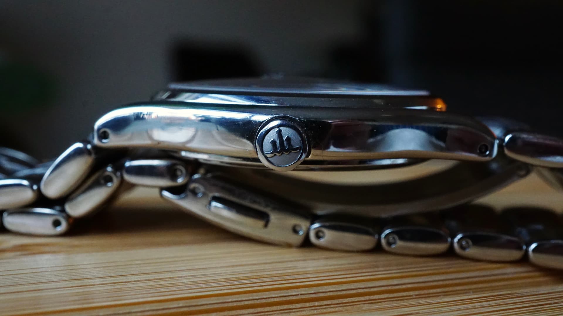 Dat zie je ook aan de kast. Die is rond. Bijna blobby. Hij doet me qua vormtaal bijna aan een old school Ebel denken. Deze kast is 35mm van doorsnee, en maar 8,1mm dik. Daarmee is het het dunste horloge in m’n verzameling, en kijkende hoe de bracelet door loopt vanaf de lugs voelt het eerder als een juweel dan als een horloge. Van kast naar bezel naar glas is stepped, en het glas ligt lichtjes bollend bovenop. Het geef een kiezel-achtige vibe die erg comfortabel draagt.