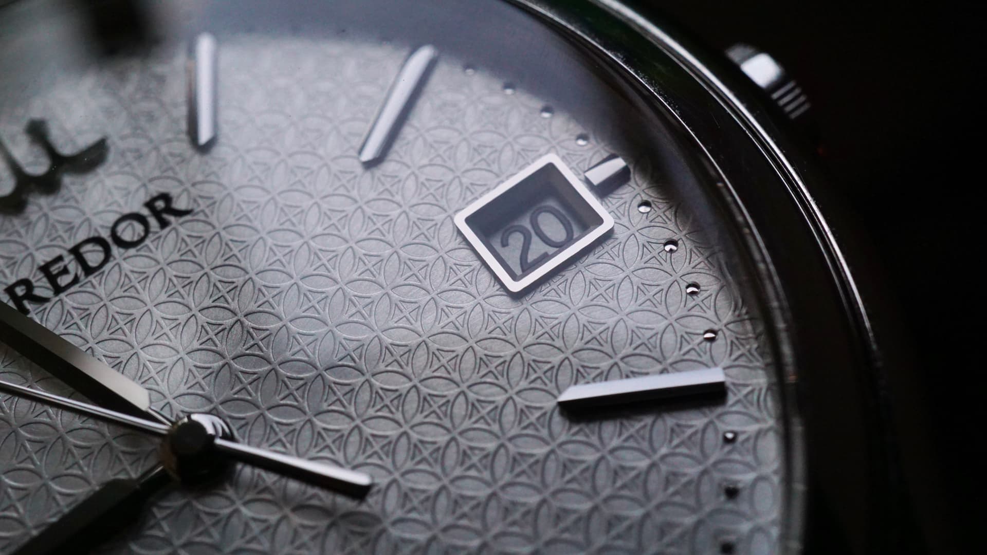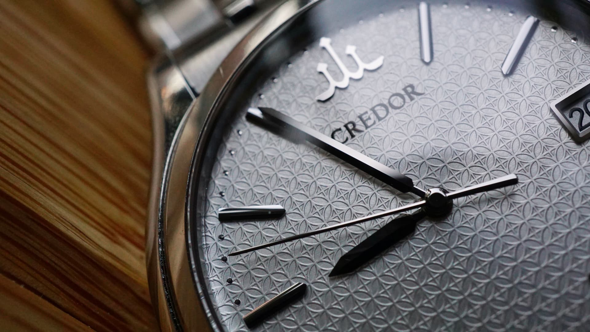 Van dat vertrekpunt komen we ook bij de wijzerplaat uit. Het patroon op de plaat geeft een dynamische sunburst die in vrijwel elk licht subtiel luxueus lijkt te zijn. Het is niet te veel, maar ook niet te weinig, wat sunburst betreft, en het wordt gebroken door de geometrische vormen. De indices, minute track en het datum venster zijn erg mooi gedaan, en doen grappig genoeg in niets denken aan een Grand Seiko. Credor is simpelweg een totaal andere design filosofie, maar het doet zeker niet onder voor een GS.