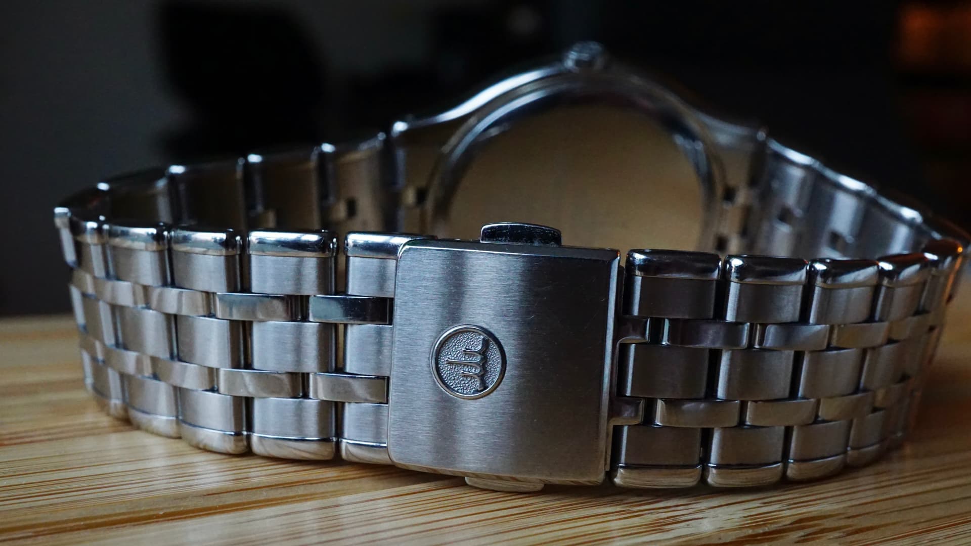 De bracelet is fantastisch. Hij articuleert als een dolle, is dun, licht, soepel, en ik vind 'm mooi. Het is gewoon ouderwets pin and collar, wat ik veruit het superieure systeem vind. Verder is de clasp klein maar mooi gemaakt, en draag het geheel erg fijn. Ik vind dit misschien eleganter dan m’n Santos. Overigens, er zijn wat schaduwen te zien bij de end links, op foto’s. Dat zijn geen beschadigingen, dat zijn schaduwen. De end links zijn niet makkelijk op foto te krijgen, maar sluiten erg mooi aan.