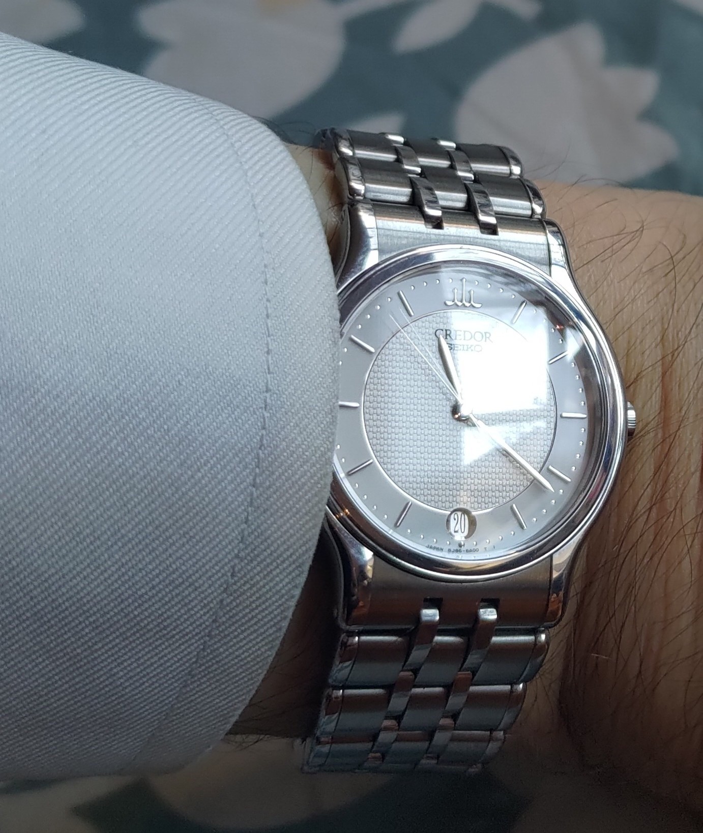 Enige tijd geleden kocht ik een 32mm Credor quartz voor mijn partner en was behoorlijk onder de indruk van de kwaliteit. Zoals de meeste, met een beetje zoekwerk, in nog uitstekende kwaliteit voor een horloge uit de vroege jaren '90 (dat ik vermoed, want de genoemde schattingen lopen nogal uiteen). Laatst was ik ook enorm onder de indruk van hoe strak en mooi een jaren '80 Dolce in tungsten kon zijn, dus heel recent pakte ik door en kocht met enige aarzeling deze Credor (Credor Seiko, het dubbele logo was minder van belang dan andere ontwerpfactoren, zoals de datum plaatsing, die elegante sectorscheiding, het geweven textuurtje) met een opgegeven 33mm doorsnee. Tot nu toe had ik als kleinste horloge voor mezelf een 35mm Havaan Tuvali die in mijn beleving draagt zoals zijn afmeting doet vermoeden. Het moest dus niet kleiner worden. De 32mm Credors van m’n partner is voor Credor een mannenhorloge, maar vind ik op mijn pols toch net wat te ielig. Naar deze modellen kon ik echter blijven kijken, omdat op deze decoratieve stalen band het horloge toch ook behoorlijke ‘presence’ om de pols lijkt te hebben. Toen ik een redelijke deal dacht te hebben gezien, heb ik de knoop, tegen mijn wens om juist te verminderen in, doorgehakt.