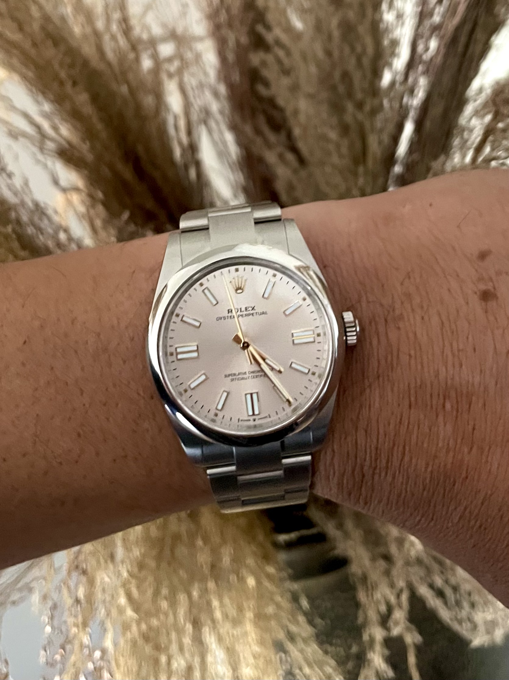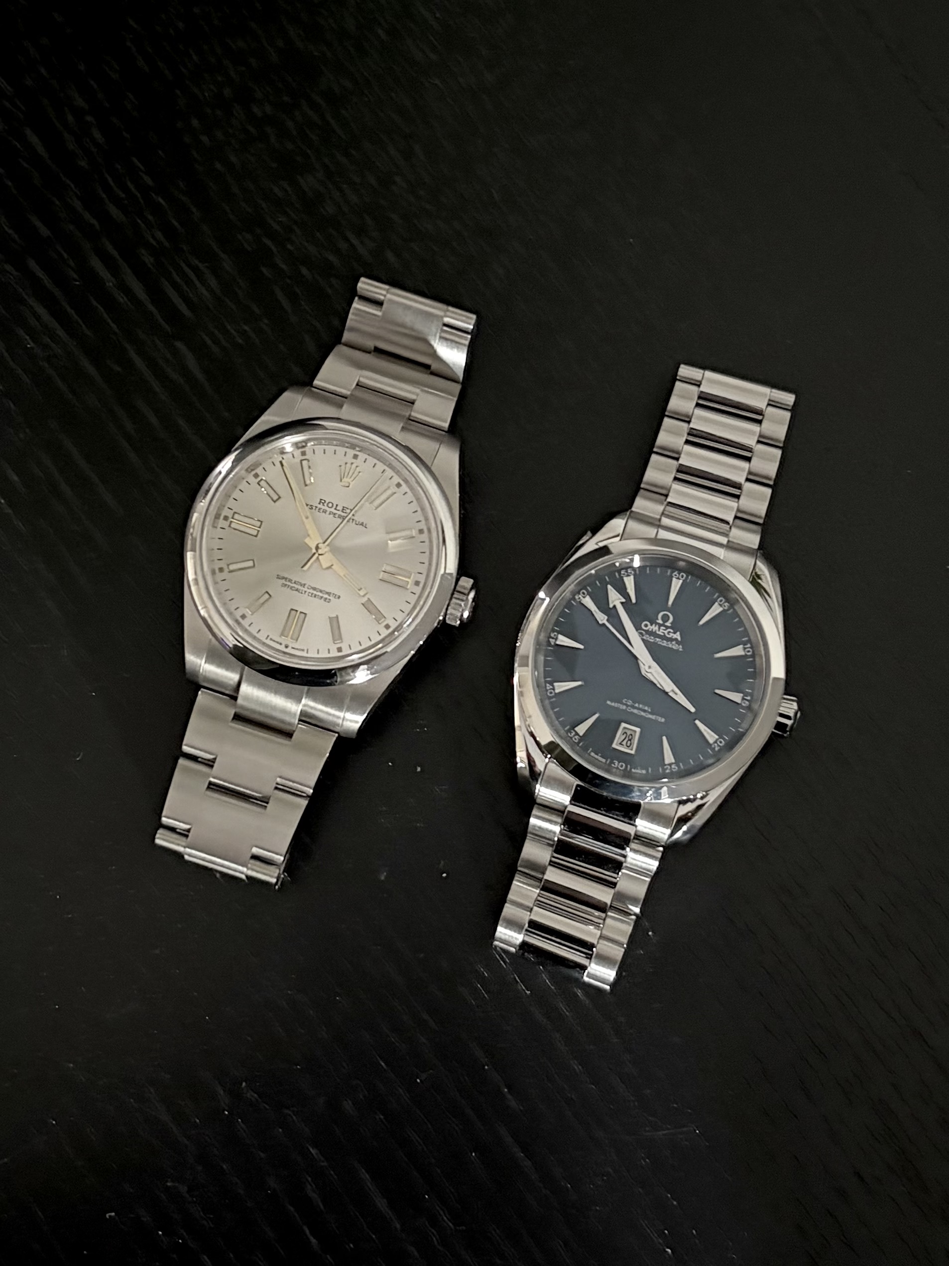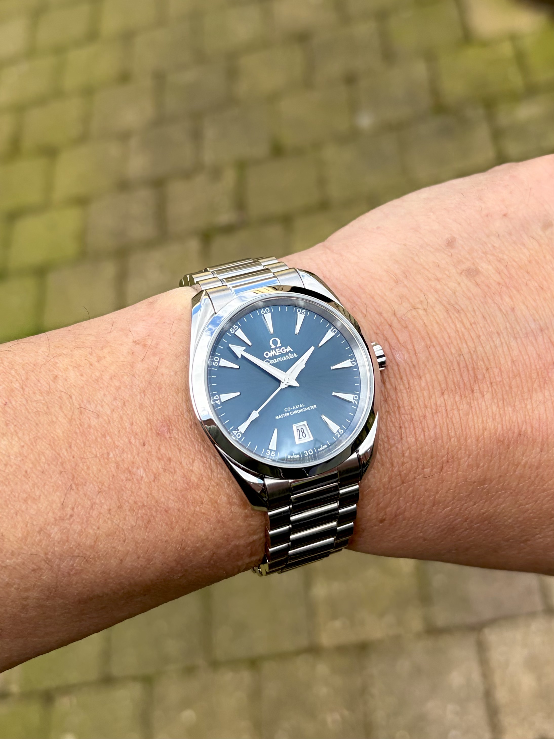Nou bij Omega heb je dan nog vele opties en het zou niet makkelijk worden om een keus te maken ware het niet dat er een mooie Aqua Terra Shades werd aangeboden in het blauwe gedeelte. Deze was in nieuwstaat, nauwelijks twee weken oud, en voor een bijna prima prijs.