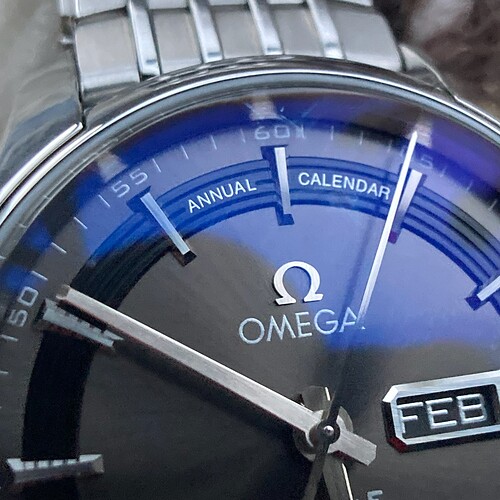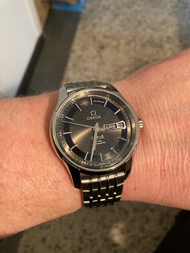 In de loop van de middag netjes door DHL aan de deur afgegeven en het grote plezier gaat beginnen. Wauw, mooier dan op de foto’s en de beschrijving (Japanners zijn toch voorzichtiger heb ik het idee). De Omega De Ville Hour Vision Annual Calendar. COSC, 100m waterdicht, 41mm zonder kroon, 49mm kop tot staart, 14 mm dik. Referentie 431.30.41.22.06.001. Het mooiste van dit alles: een saffieren uurwerkkast ![]()