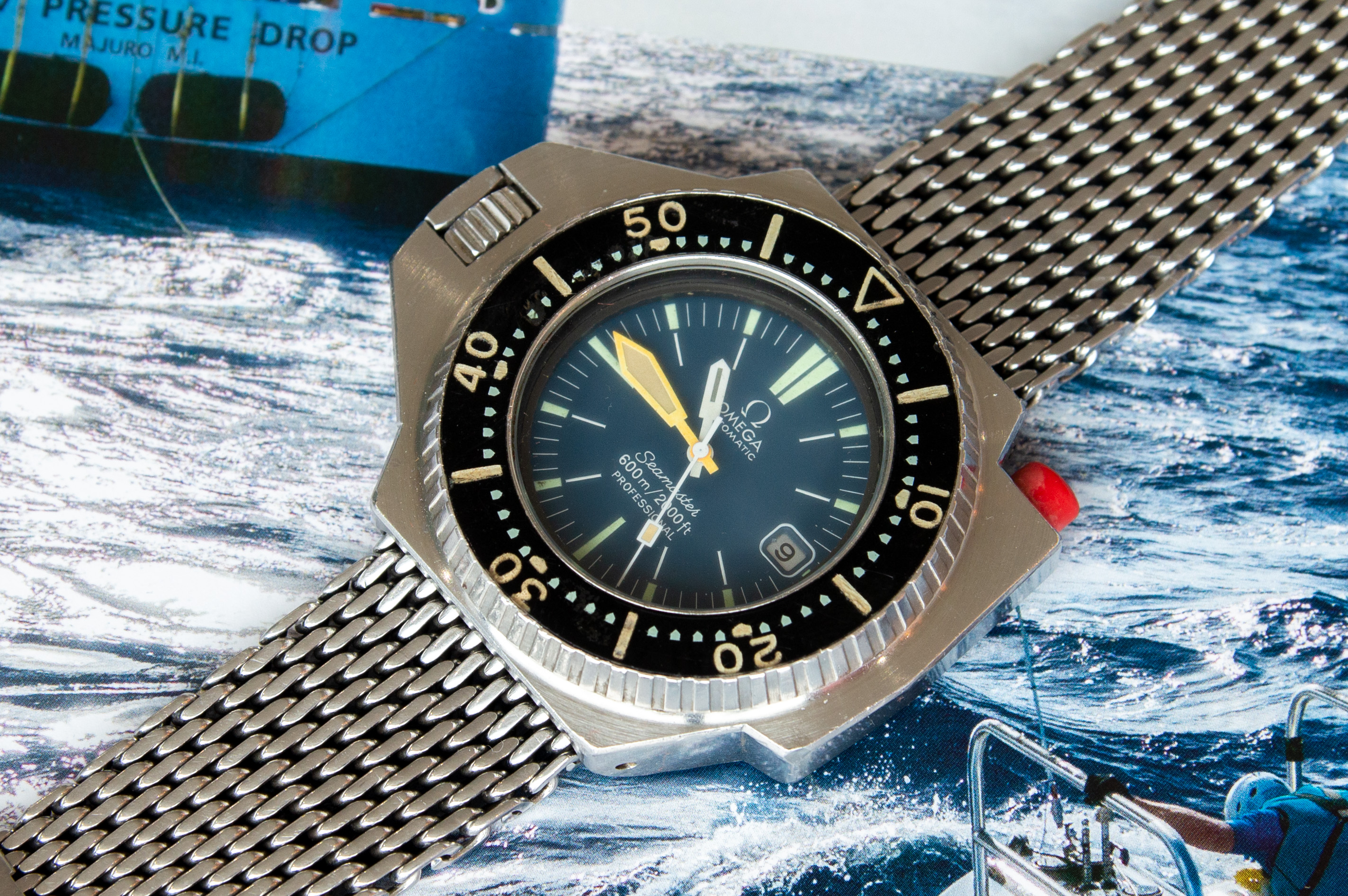 Dankzij een goeie vriend van me kon ik een volledig originele vintage Ploprof op de kop tikken. Ik had net een horloge verkocht dus dat kwam perfect uit. Deze Ploprof heeft een ongepolijste kast met originele dial, wijzers, bezels en zelfs de originele mesh bracelet. Die combinatie is ontzettend zeldzaam, aangezien er heel veel service dials en wijzers hebben, en nog meer hebben een service meshband. Maar genoeg geluld, tijd voor de eerste foto: