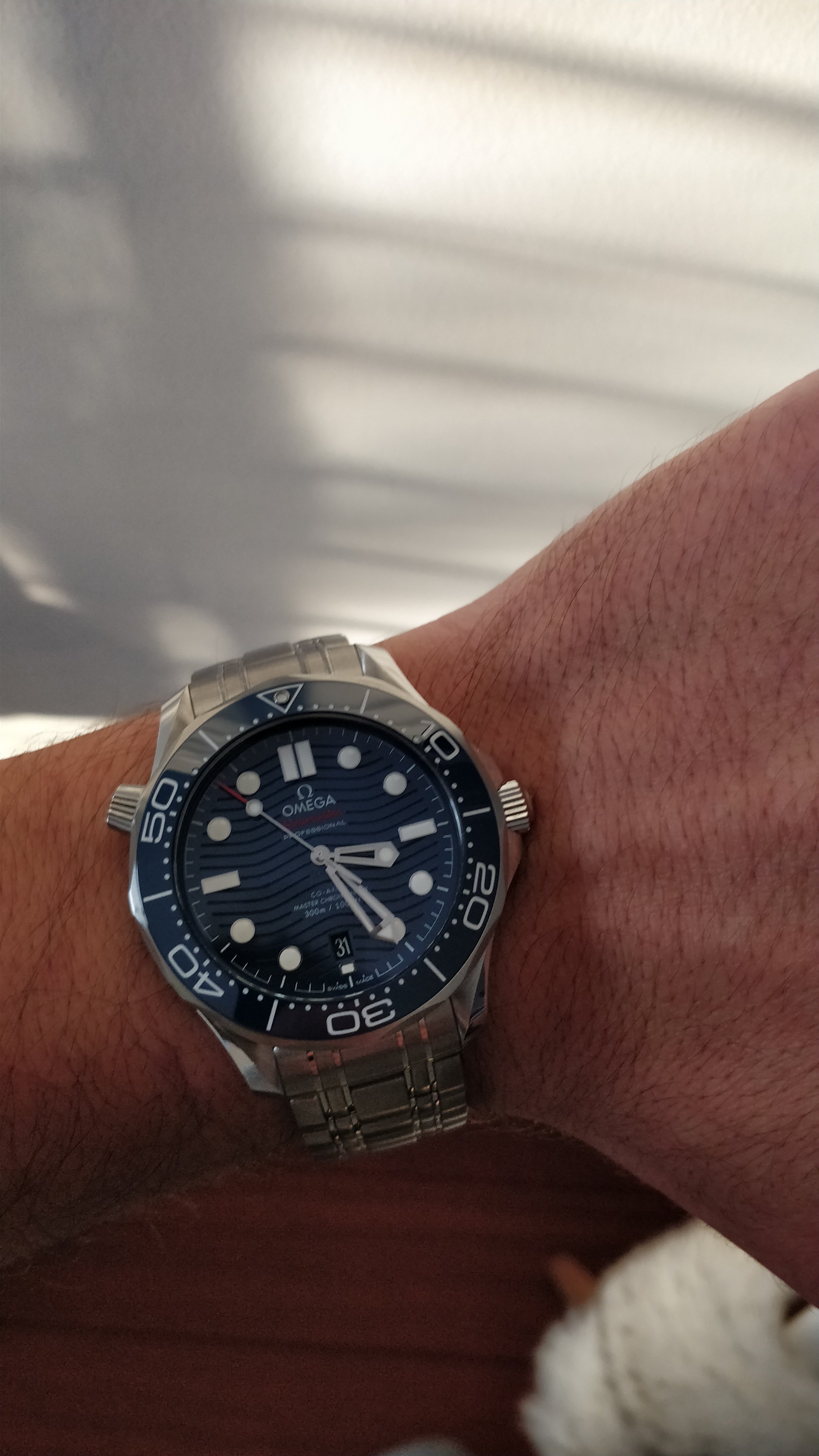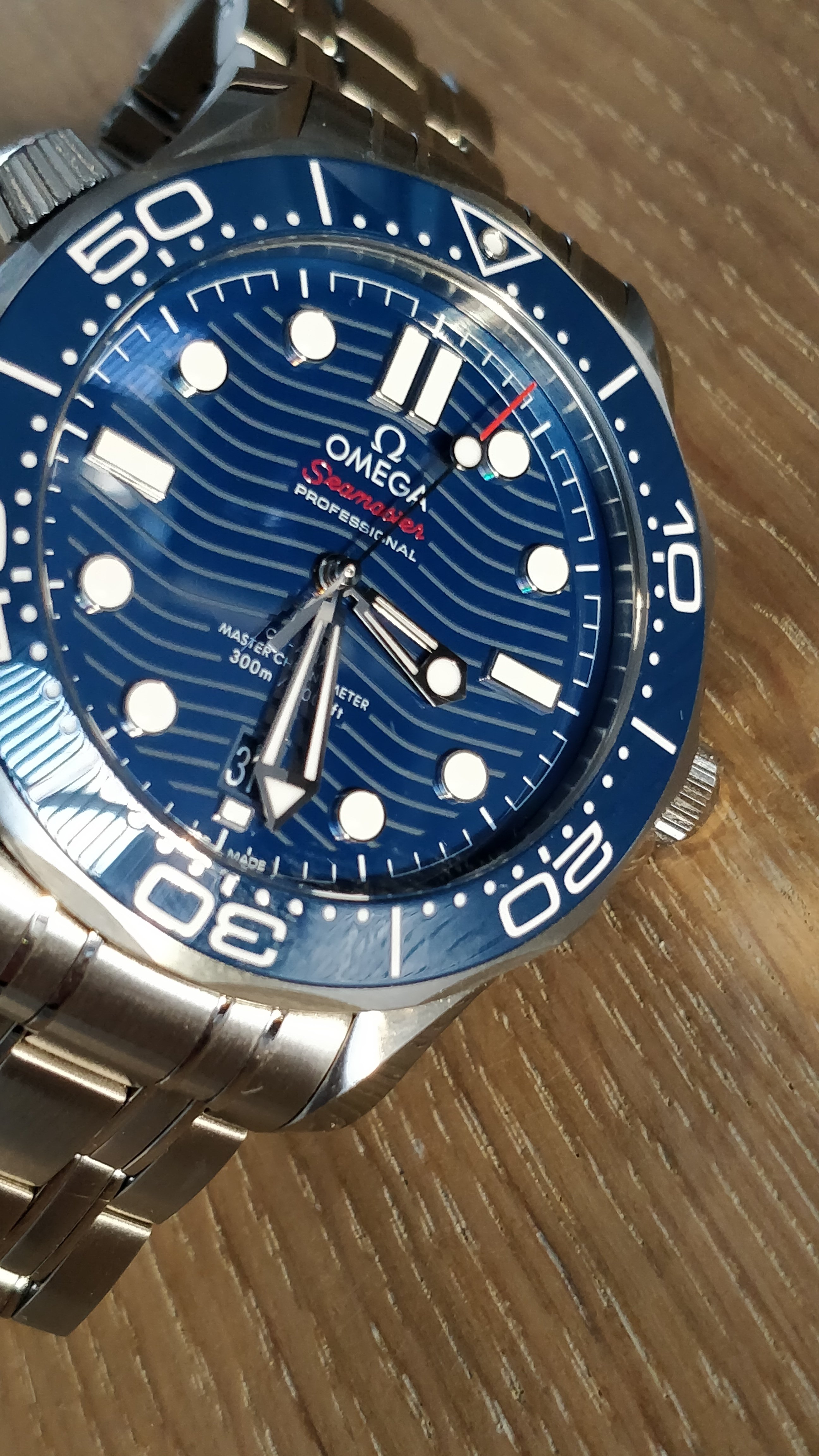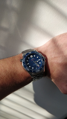 Hierbij presenteer ik met gepaste trots mijn nieuwe NA: De Omega Seamaster 300 op staal in de in de fifty-shades-of-blue-uitvoering. Ik kan mij niet genoeg uiten hoe mooi ik deze kleur vind. Ik had in het begin getwijfeld tussen de blauwe en zwarte uitvoering en ben zo ontzettend blij met deze blauwe uitvoering: ik heb geen twee momenten gehad in dat de blauwtinten hetzelfde leken. Het horloge lijkt wel een kameleon: in de avonden en op kantoor onder een pak lijkt het wel donkerblauw/bijna zwart en buiten onder de zon lichtblauw, prachtig!