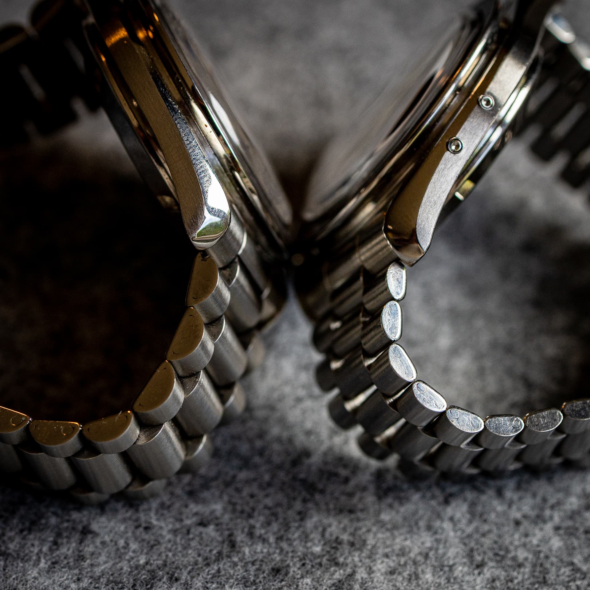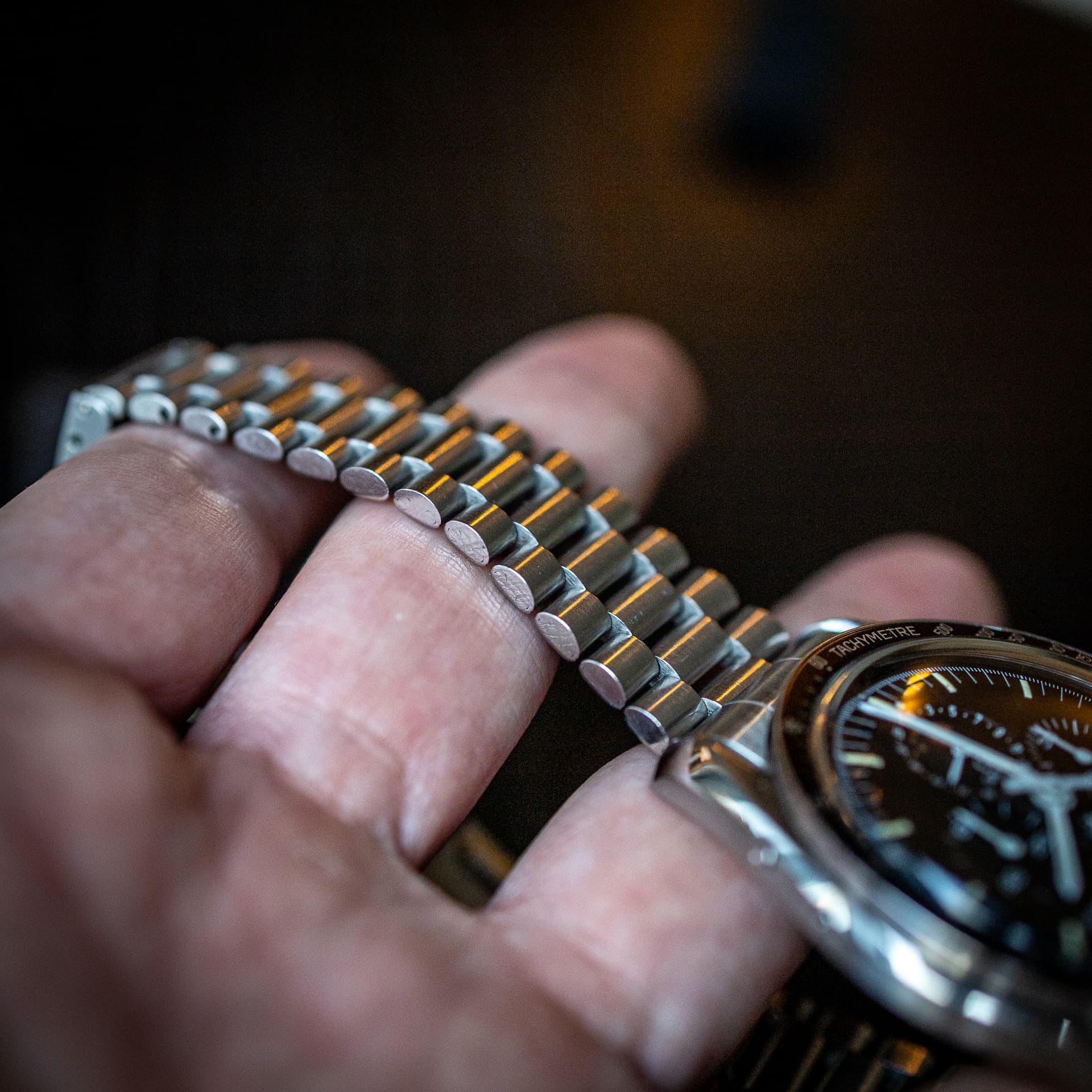 De links van de 1447 zijn ovaal en heel fijntjes, ook is de eerste Omega bracelet met solid end links, waardoor hij minder rammelt. En de eerste bracelet met “Speedmaster” op de clasp. Toch geinig detail en erg leuk om te hebben.