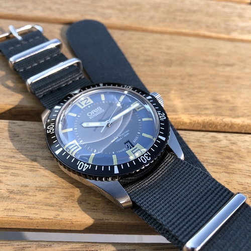 Ik heb nog even getwijfeld om de meer standaard dial-layout te kiezen, maar ben nu bewust voor deze “Deauville” vintage diver gegaan. Want ik hoop, (nergens op gebaseerd overigens), dat Oris volgend jaar, (want dit jaar brengen ze geen 65-divers meer uit, dat weet ik wel), een 65 uitbrengt met een matzwarte dial en printed numerials. Een beetje zoals de Hodinkee LE van vorig jaar. Dus zonder teveel opsmuk. Zodra die uitkomt bestel ik die en heb ik twee horloges met een heel eigen gezicht. In gedachten zie ik ze al in mijn horlogebox liggen!