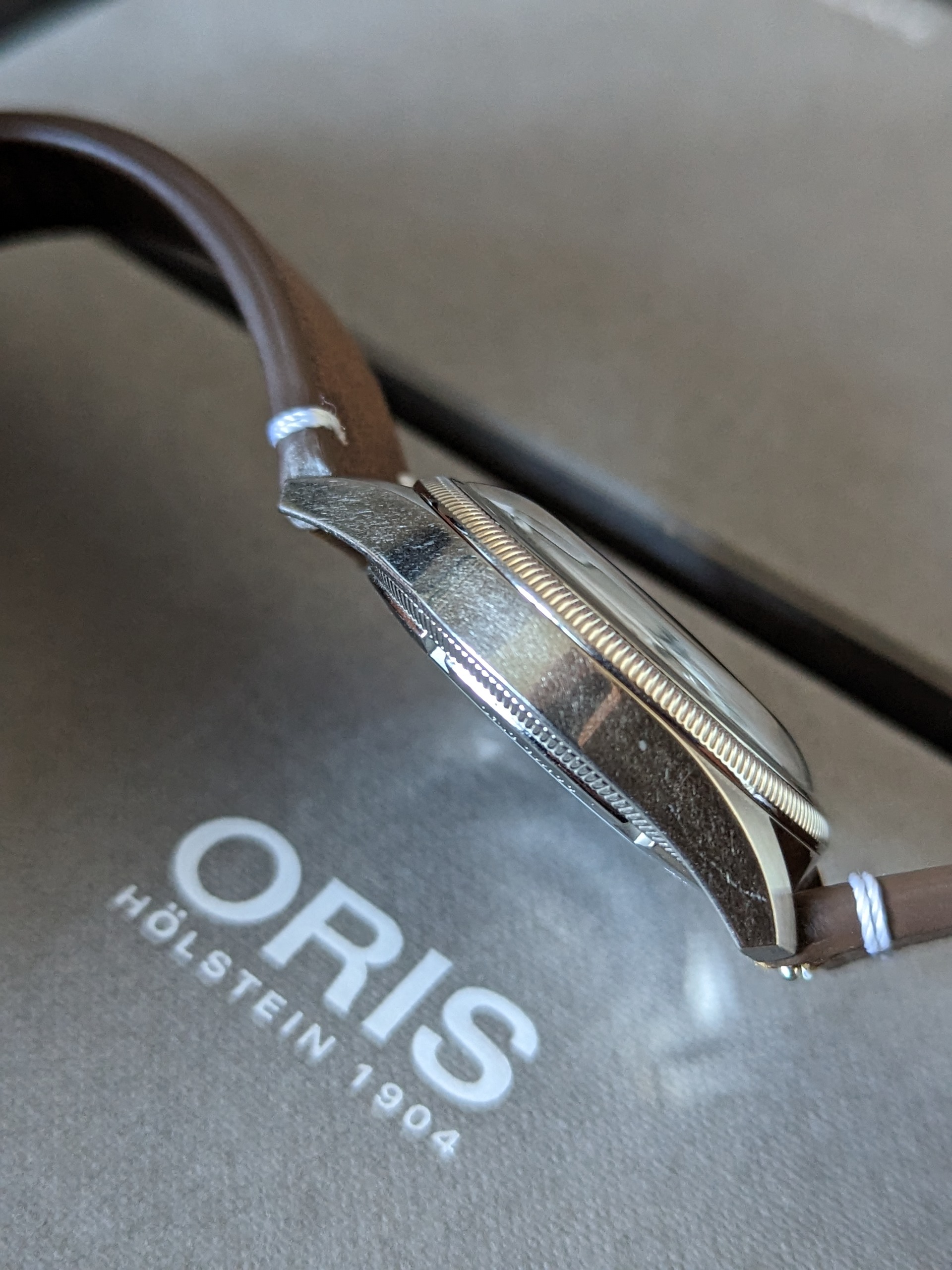 Thuis bij ontvangst viel alles me reuze mee. Ja, er zaten krasjes op maar enkel bij bepaald strijklicht. Ik kon me er (voor dit bedrag) niet direct aan storen omdat hij er verder nog puntgaaf uit zag. Er zat een extra originele Oris buckle bij en ook kon ik het horloge nog op eigen naam registreren voor extra garantie aangezien de beste meneer dit naar eigen zeggen zelf niet wist