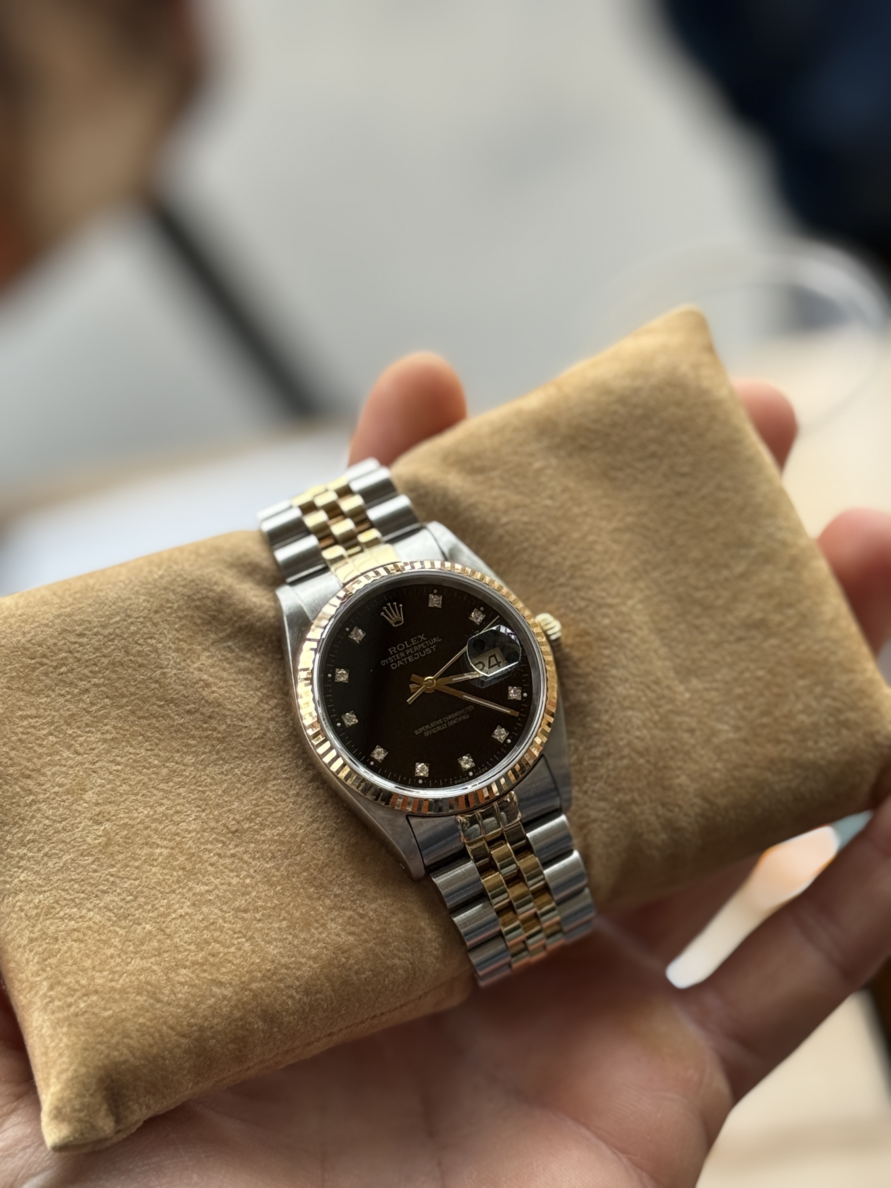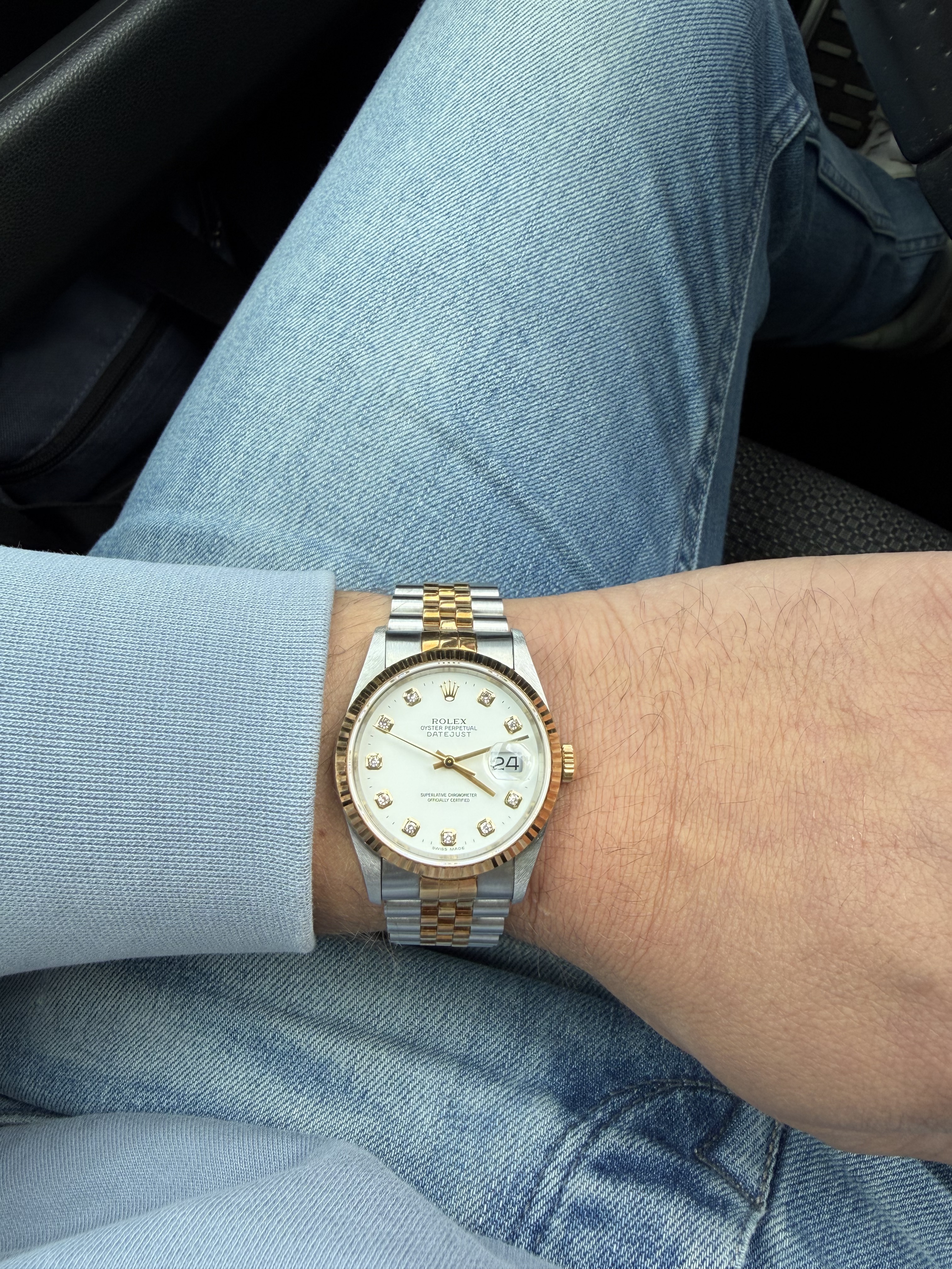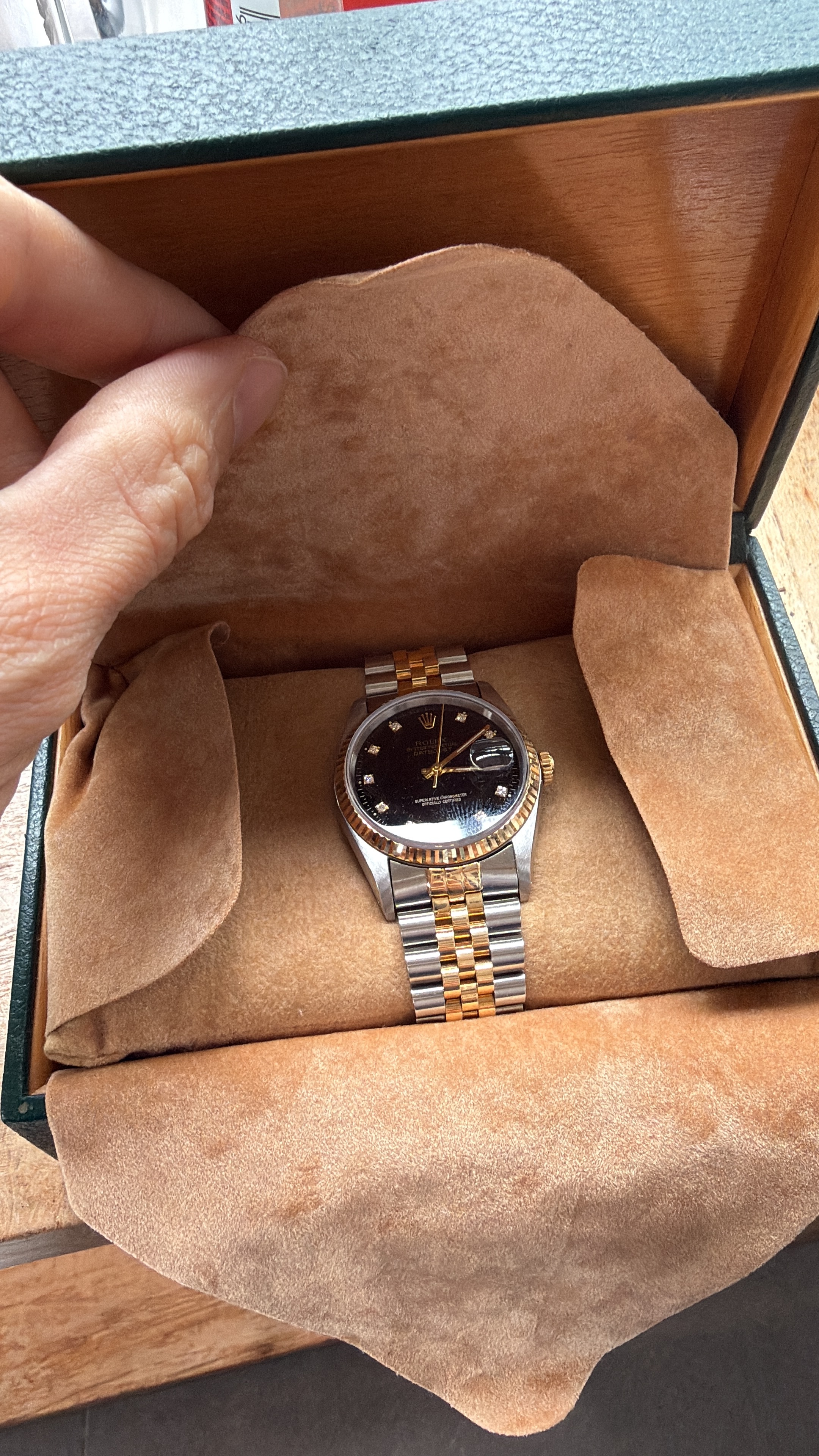 Bicolor met diamanten i.c.m. de zwarte wijzerplaat staan ‘m heel goed vind ik.