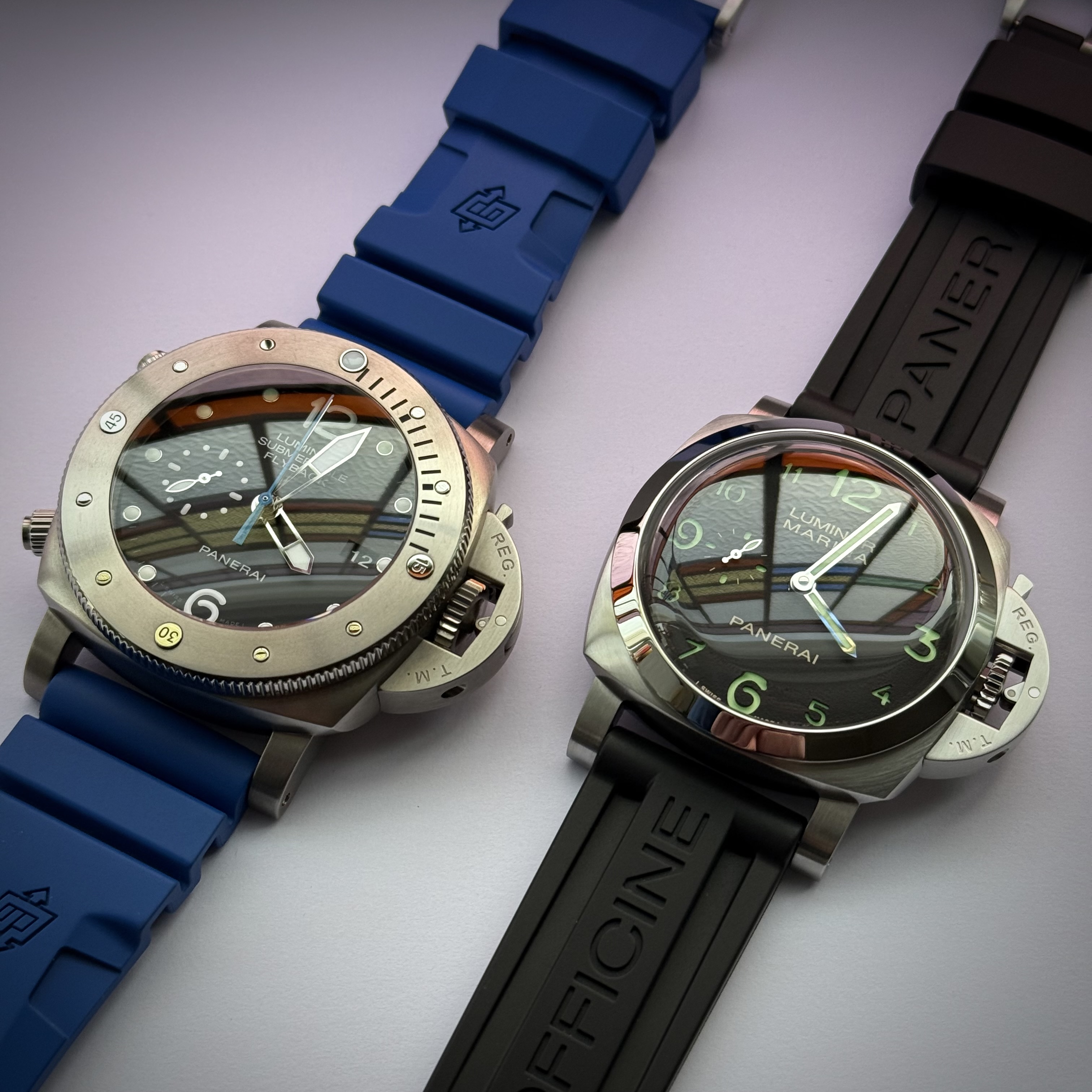 Panerai heeft twee soorten rubberbanden. Zie daarvoor de eerste foto hieronder. De blauwe band heeft een soort harmonica stuk aan beide zijden. Daardoor kun je hem een gaatje strakker doen waardoor hij comfortabel blijft. De zwarte op rechts vind ik mooi, maar strak is meteen strak omdat er geen “flex” stukken in zitten. Dat is eigenlijk het enige wat ik te zeiken heb over mijn nieuwe horloge