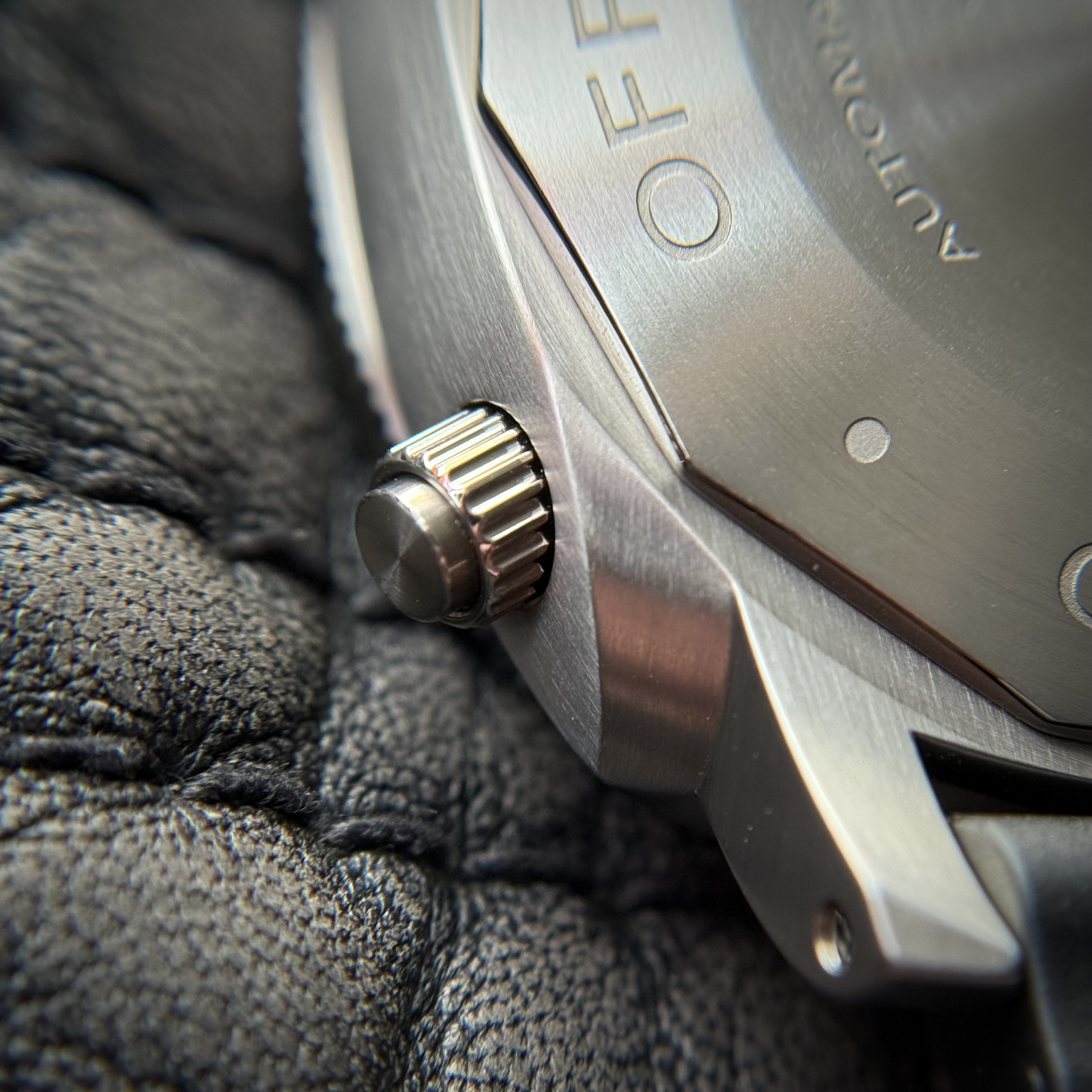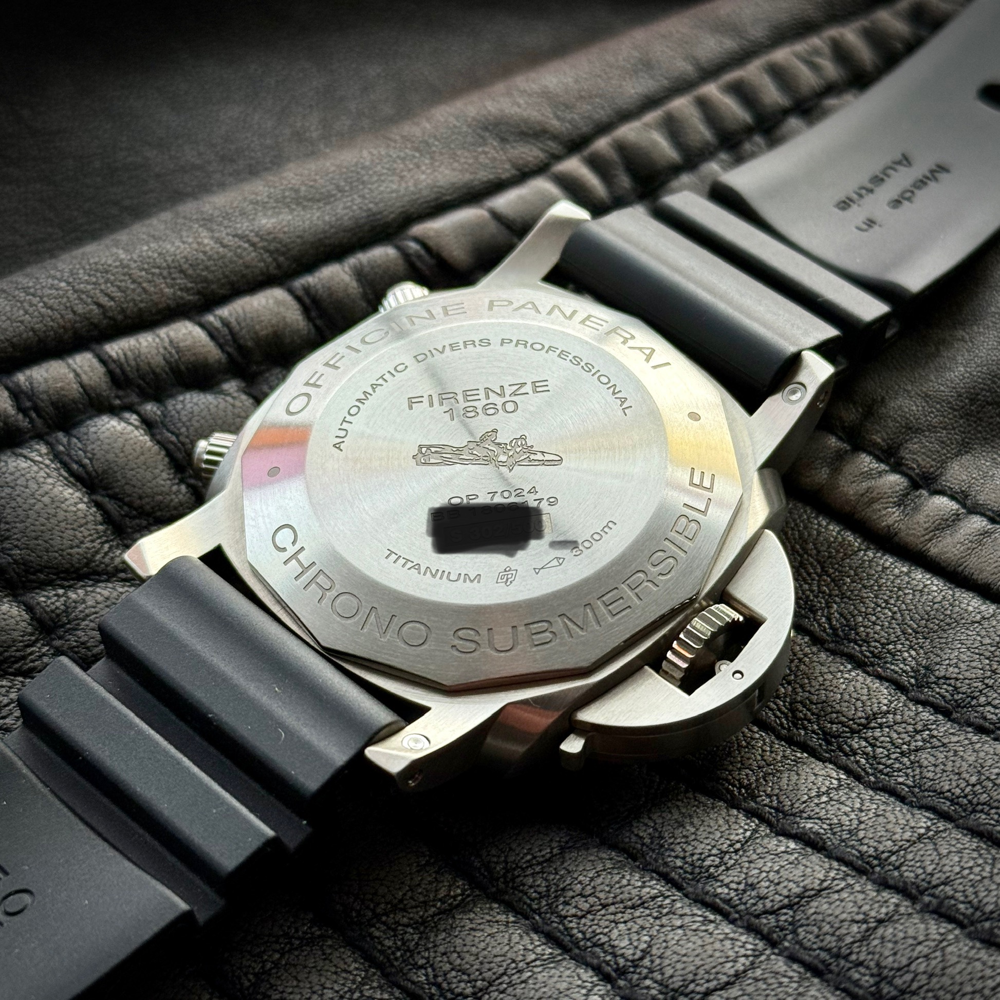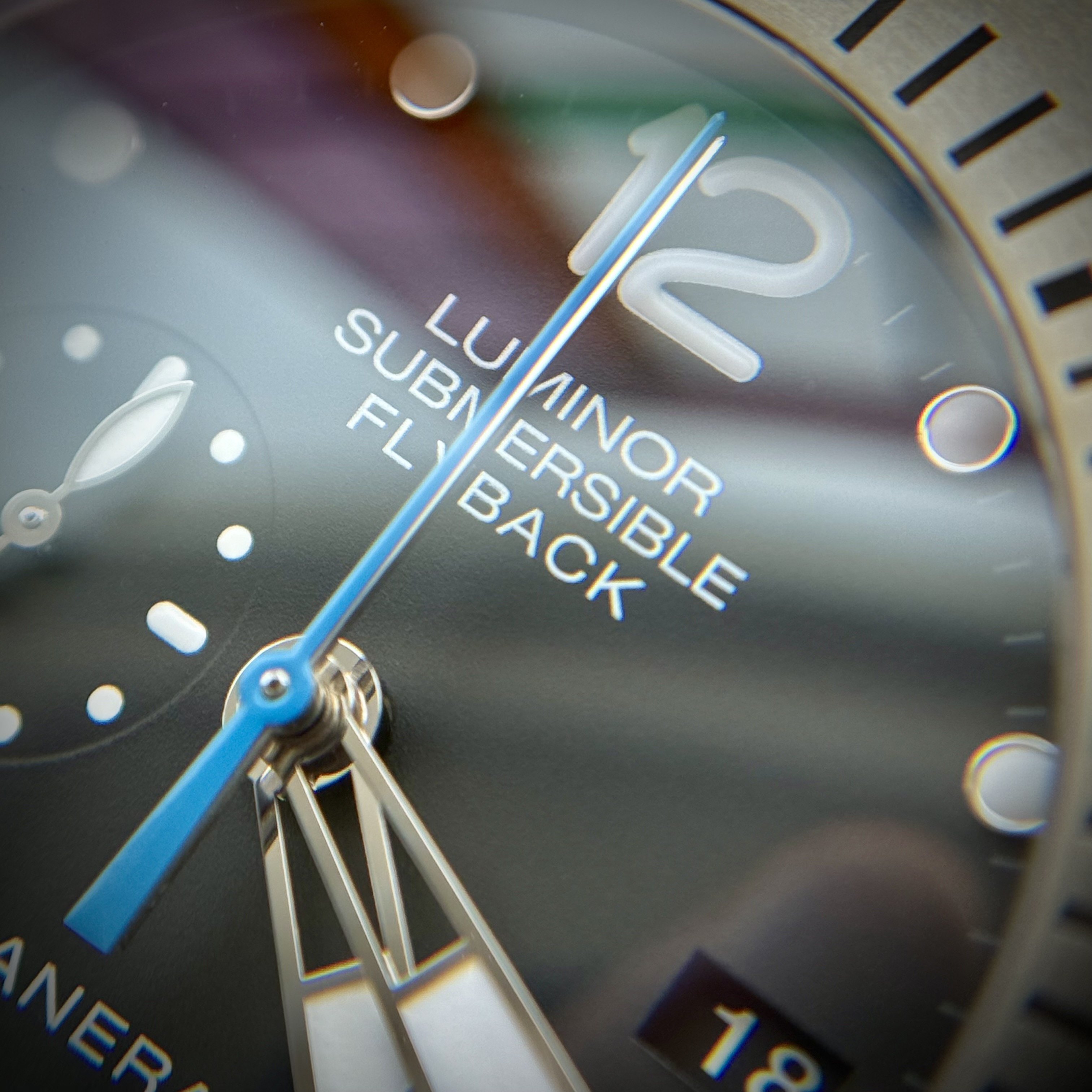 47mm in titanium met een leuke complicatie; de flyback chronograaf. Onder de blauwe secondenwijzer zit een zilverkleurige minutenwijzer die uiteindelijk, na het verstrijken van 60 seconden, mee gaat huppelen. Verder voorzien van datum en als je de kroon uittrekt tot aan de tweede stop springt de secondenwijzer omhoog. De datum verzet je door de urenwijzer te verstellen. Net als bij een GMT van Rolex. Het betreft een P. 9100 uurwerk wat naar ik begrijp uit de eigen “keuken” komt. Verder heeft het een gangreserve van 3 dagen.