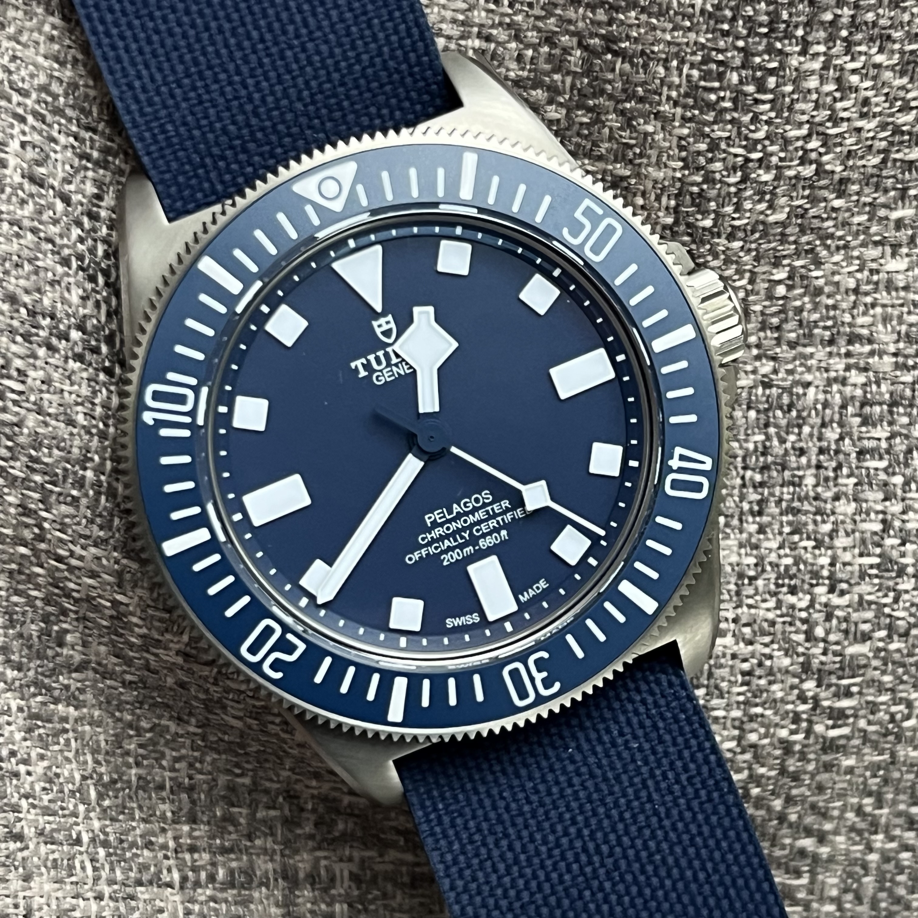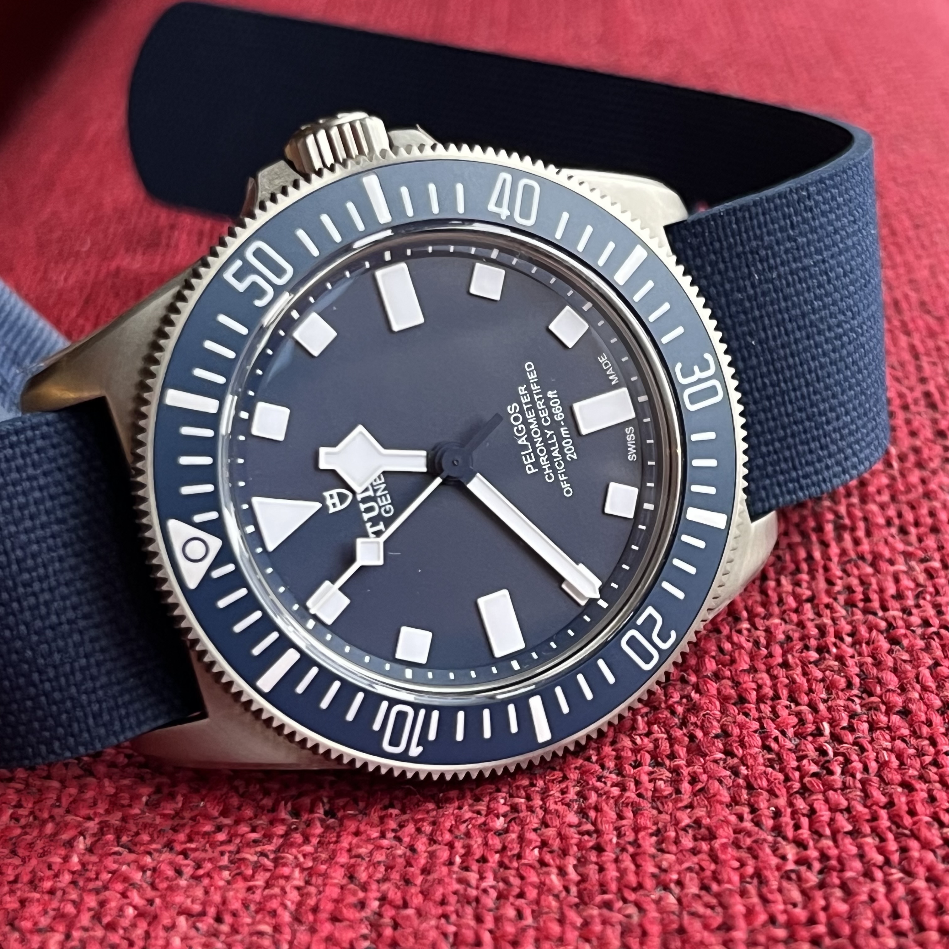 Het titanium heeft een subtiele glans. Donkerder dan roestvrij staal. Niet zo mat als bead blasted. De helder witte indices zónder randjes. Het blauw is understated, iets minder verzadigd. I’m a sucker for blue dials
