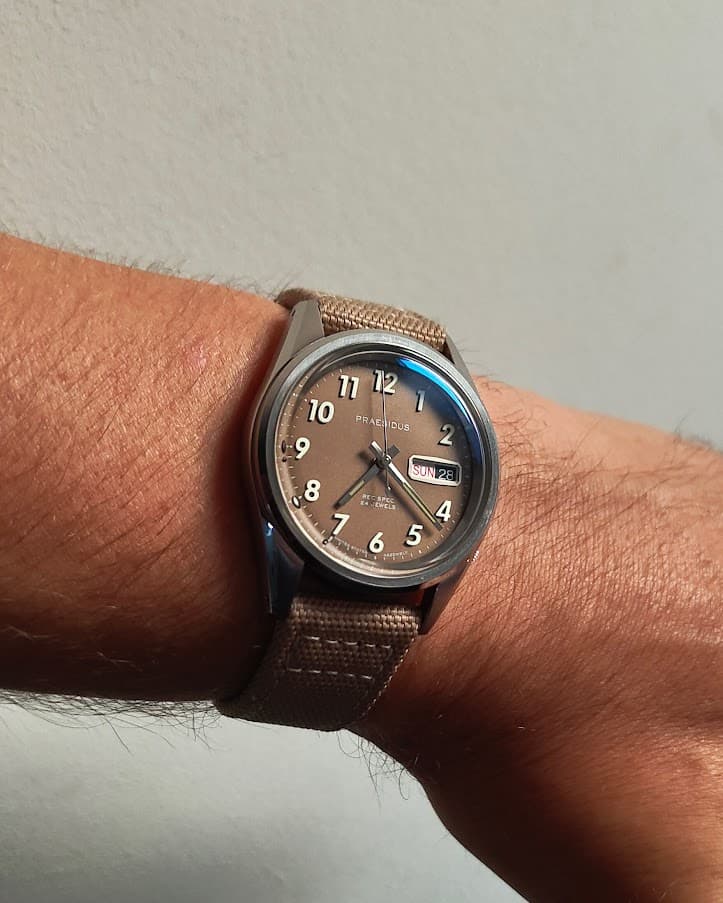 Ik kwam een exemplaar tegen op Ebay met een khaki bruine dial. Bruin was heel gedurfd voor me, maar ik dacht de gok te wagen. Idee was dat de Vario een strakke fieldwatch is die perfect op zwarte bandjes staat, en de Rec Spec een warme tegenhanger die perfect op khaki/beige bandjes staat. Dat gokje heeft niet gewerkt, want ik geraak toch niet gewend aan de bruine wijzerplaat. Maar dat is persoonlijke smaak en doet verder niets af aan het horloge zelf.