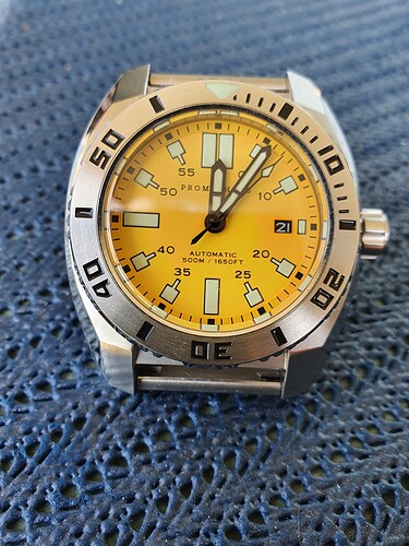 Een tijdje geleden las ik een berichtje van Chris waarin hij constateerde dat hij eigenlijk niet zoveel kleur in zijn collectie had. Veel blauw-grijs-zwart en wit, je kent dat wel een beetje de ouwe l… kleuren . Dus dacht laat ik ook nog maar eens in mijn boxen kijken en ja hoor, ook ik heb veel te veel van die ouwe l… kleuren in mijn boxen op wat enkele na. Dus dacht daar moet nu maar eens verandering in komen en ben eens op zoek gegaan in het blauw. En daar kwam ik dus dit horloge tegen, knal geel en die zat nog niet in de collectie. Gelijk contact opgenomen met @SSFS over dit horloge. Deal snel gesloten en het hoeven niet altijd dure horloges te zijn blijkt maar weer.