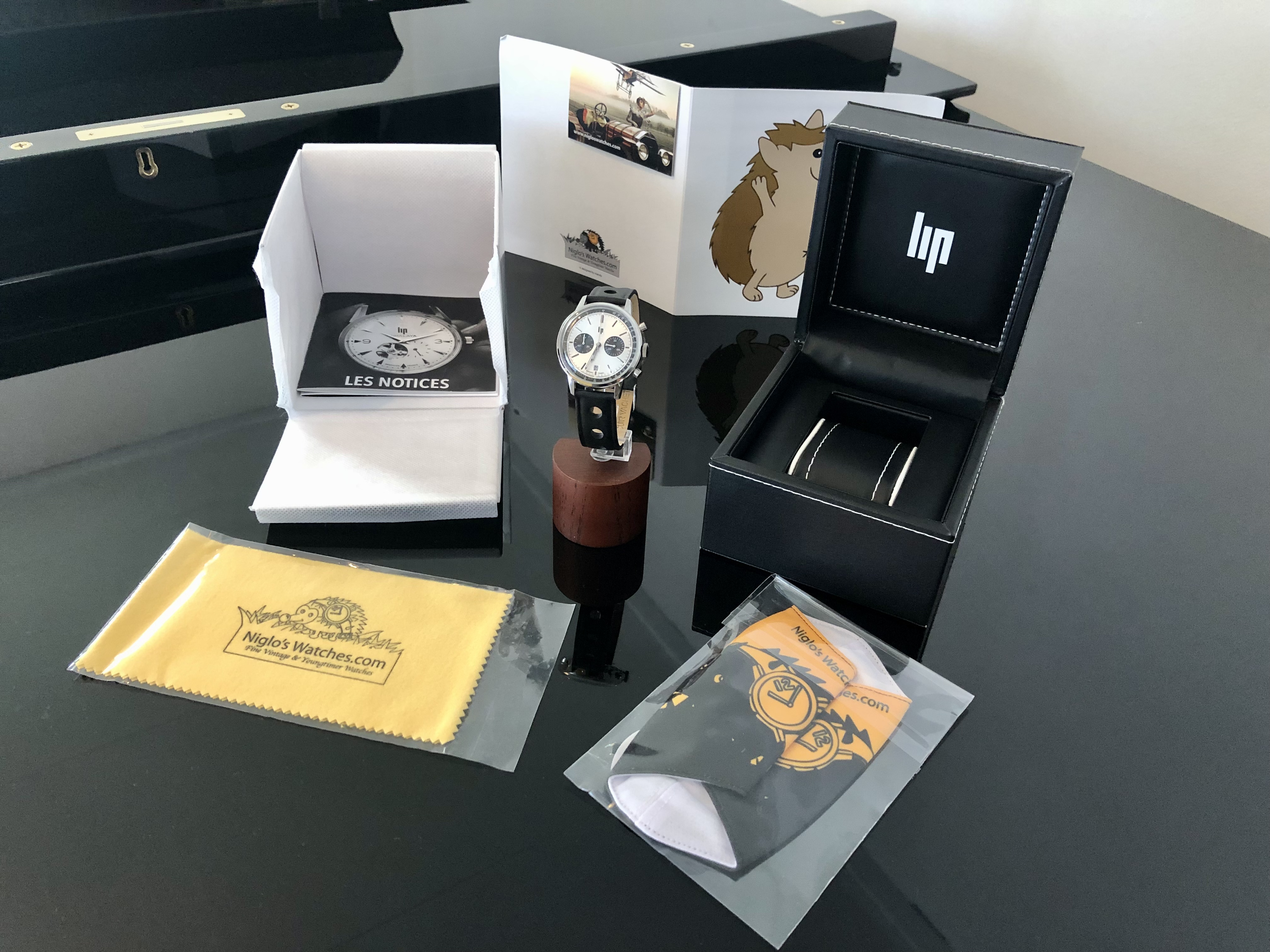 Het horloge werd geleverd met een degelijke LIP horlogebox en Omdoos, LIP certificaat, garantiekaart van Nigloswatches.com. Een Niglo’s mondkapje en Niglo’s Zilver/goud doekje zat er ook nog bij.