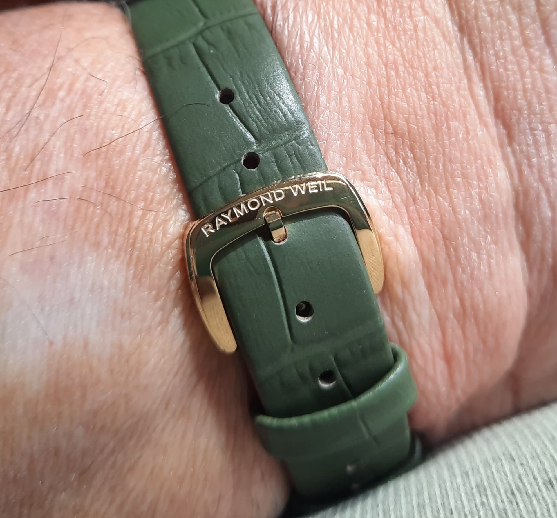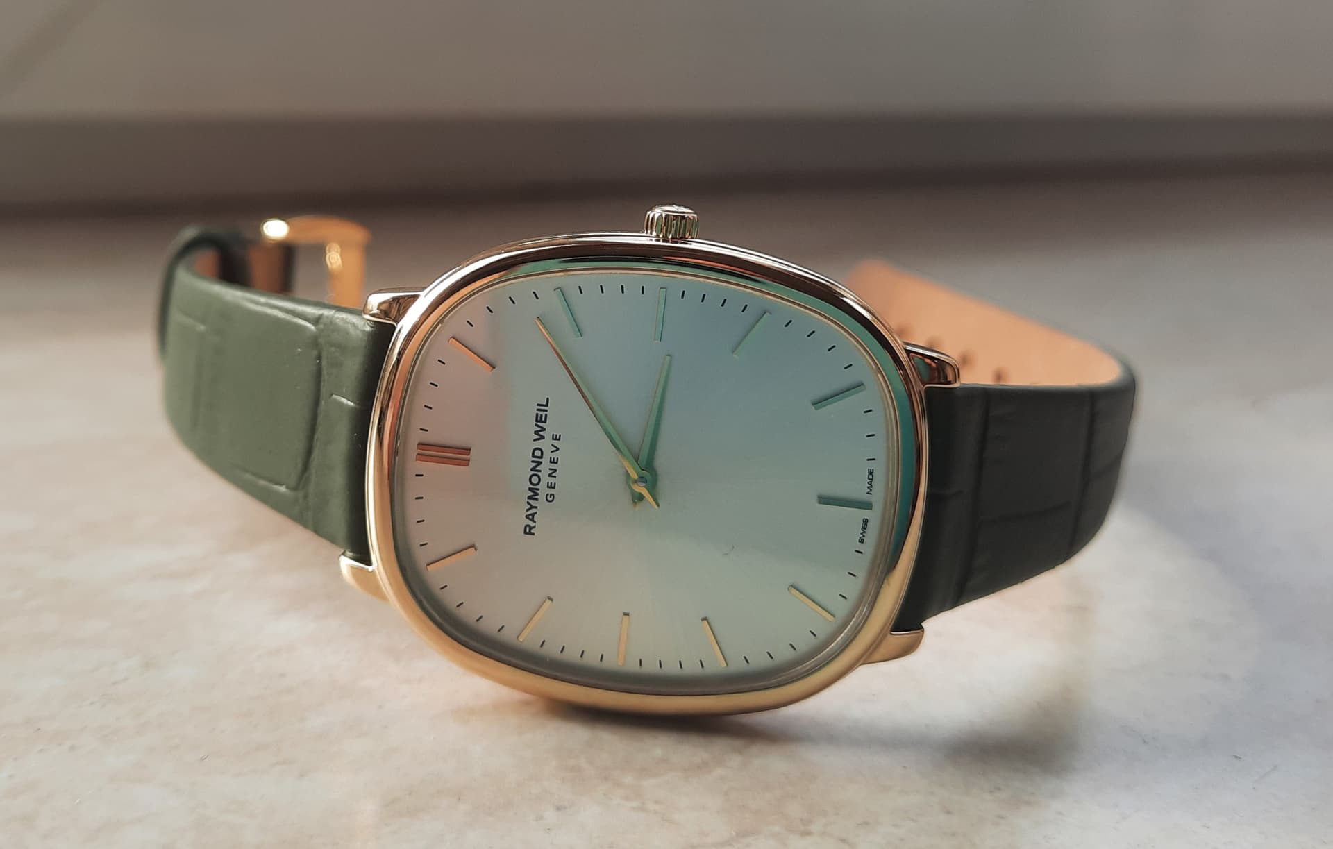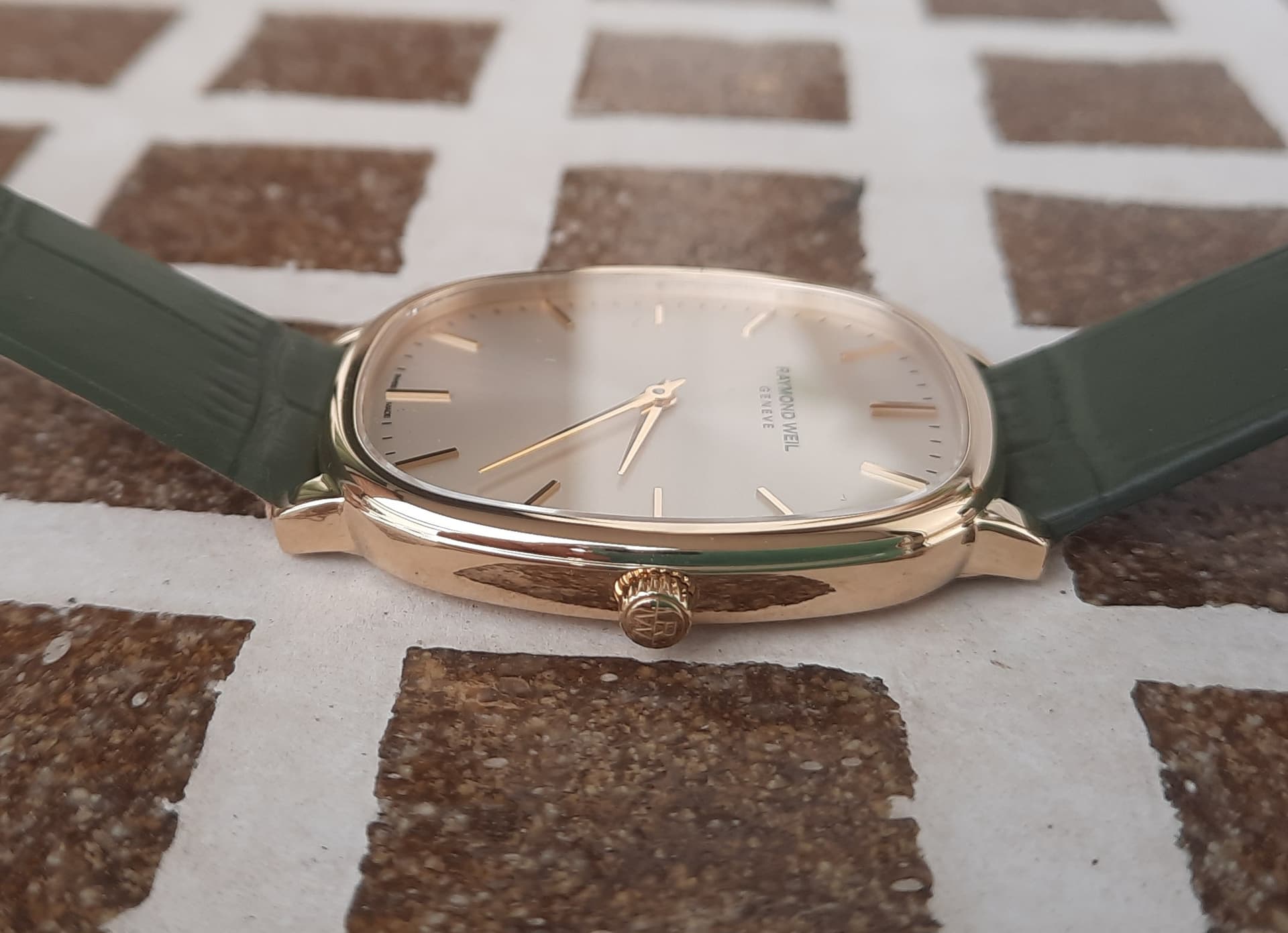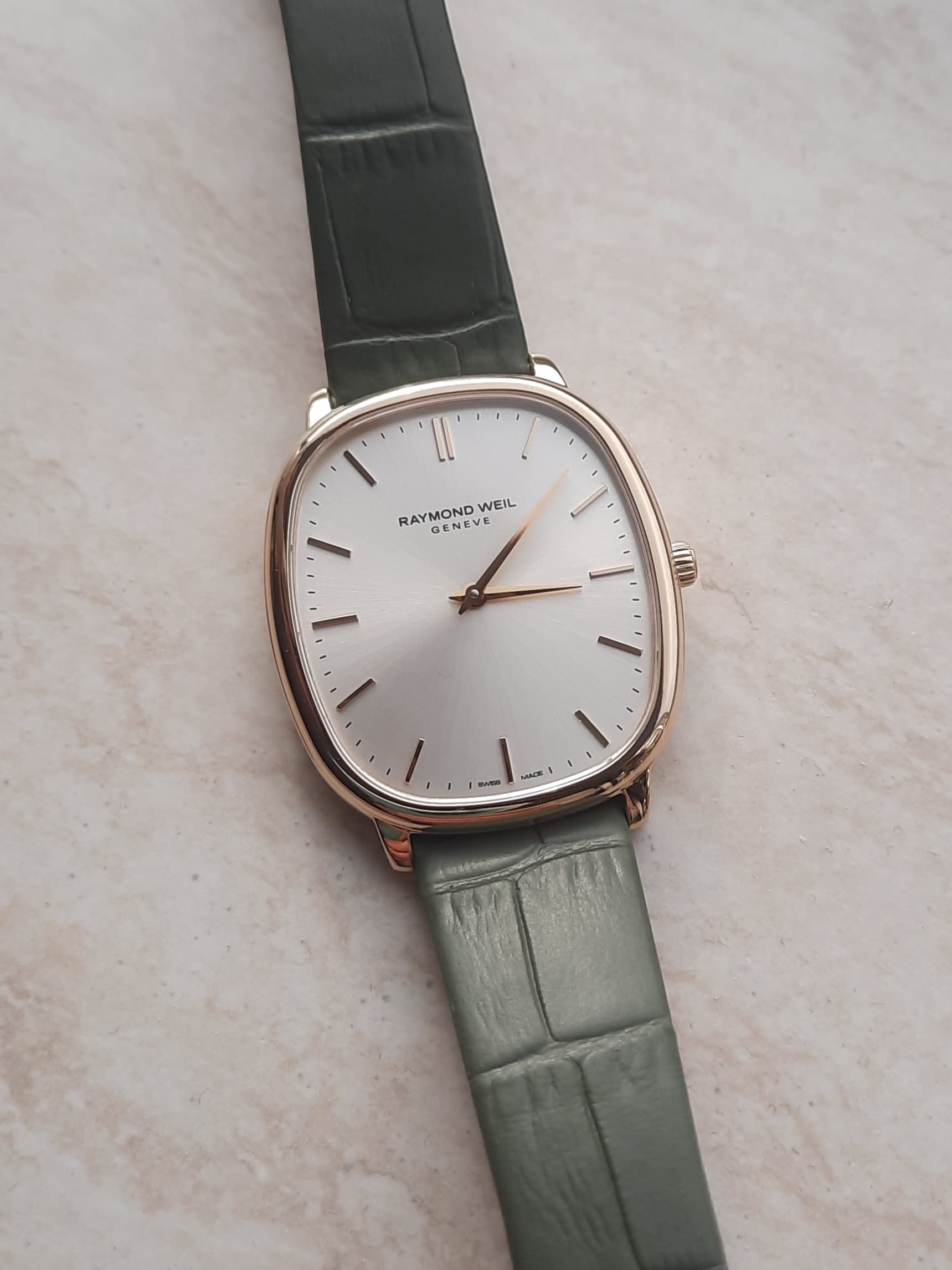 Met de olijfgroene kalfslederen band maar zonder datum of secondenwijzer maakt dit horloge tot een dresser pur sang. Ook een gesigneerde kroon is aanwezig.