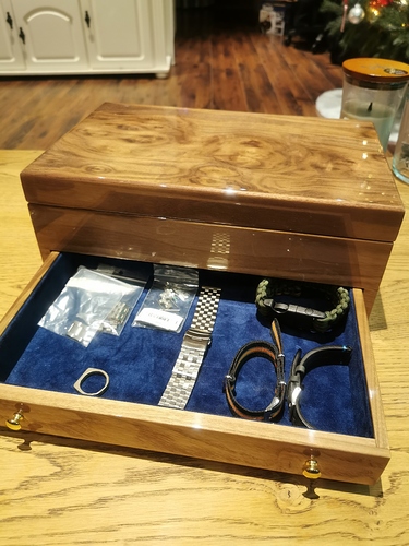 De Seamaster werd geleverd in een prachtige houten kist (zie de NA van Quantore). Hierdoor begon een oud verlangen weer te kriebelen. Er moest een waardige horlogedoos komen. Echt hout, niks van dat kartonen spul waar de collectie in lag.