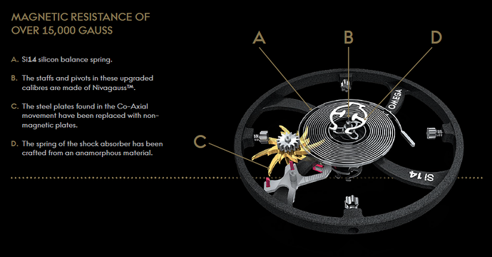 Ook is het uurwerk tegen magnetische velden van 15,000 gauss (of 1.5-Tesla), dit komt overeen met het magnetische veld in een MRI scan! Ter referentie: Rolex heeft de Milgauss special ontwikkeld voor het werken in wetenschappelijke omgevingen met veel magnetische straling. Deze is bestand tegen (mille) 1,000 gauss. Oftewel; de omega is 15x sterker bestand tegen magnetische velden! Ook de schok resistentie van 5,000 g is niet misselijk!