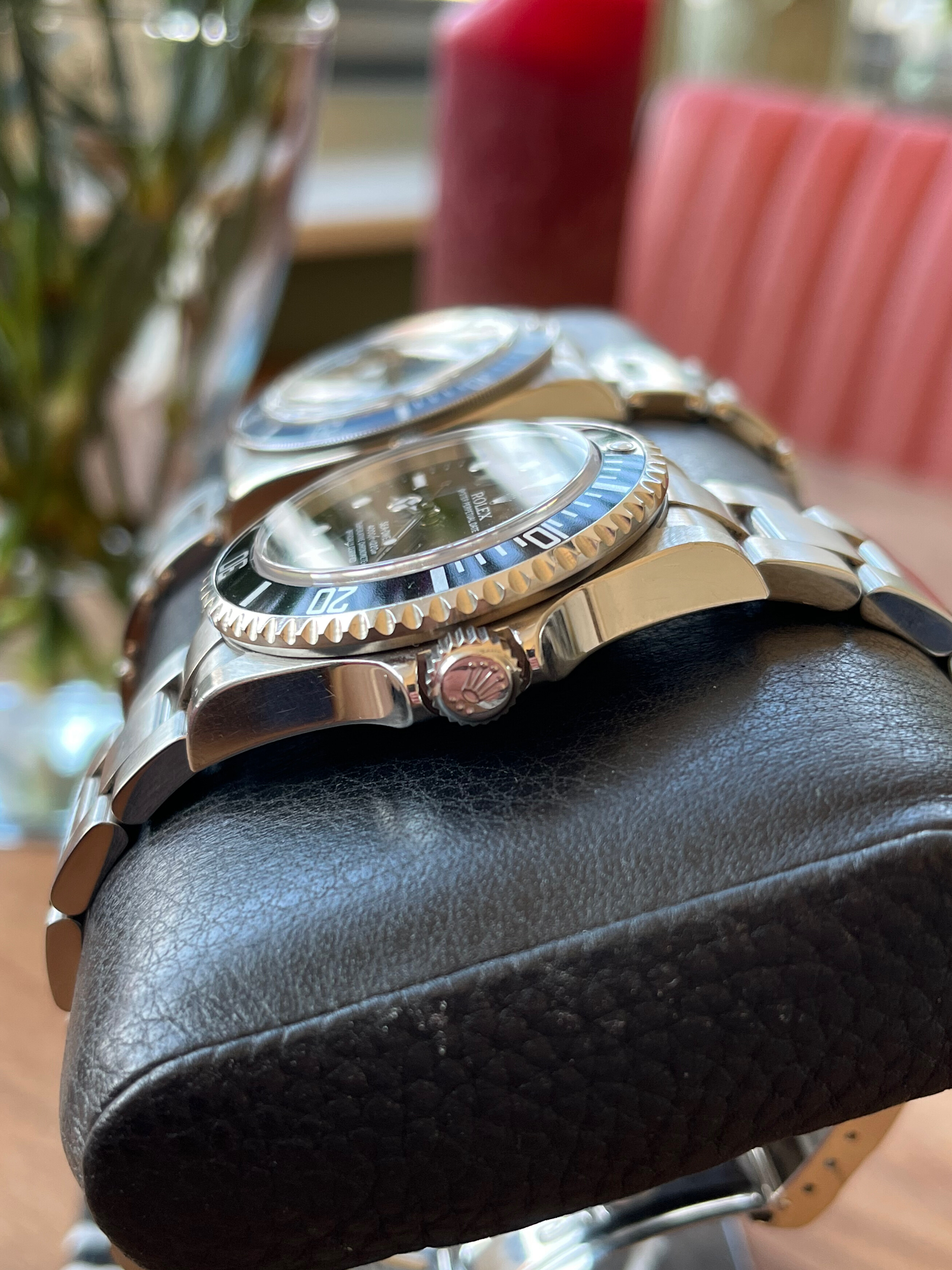 Toen ik mijn zoektocht begon keek ik vooral naar de 5-digit Submariner en dacht automatisch dat een Sea-Dweller te groot zou zijn voor mijn pols. Maar nadat ik een artikel had gelezen over de Sea-Dweller van Robert-Jan Broer (van Fratello) waar hij aanstekelijk enthousiast over schrijft ben ik het horloge zelf gaan passen bij S&C Pre-owned en sloeg de vonk over. Het voelt wat dat betreft als een Sub Plus. (Het artikel deel ik helemaal onderaan nog even, wat erg leuk is om te lezen).