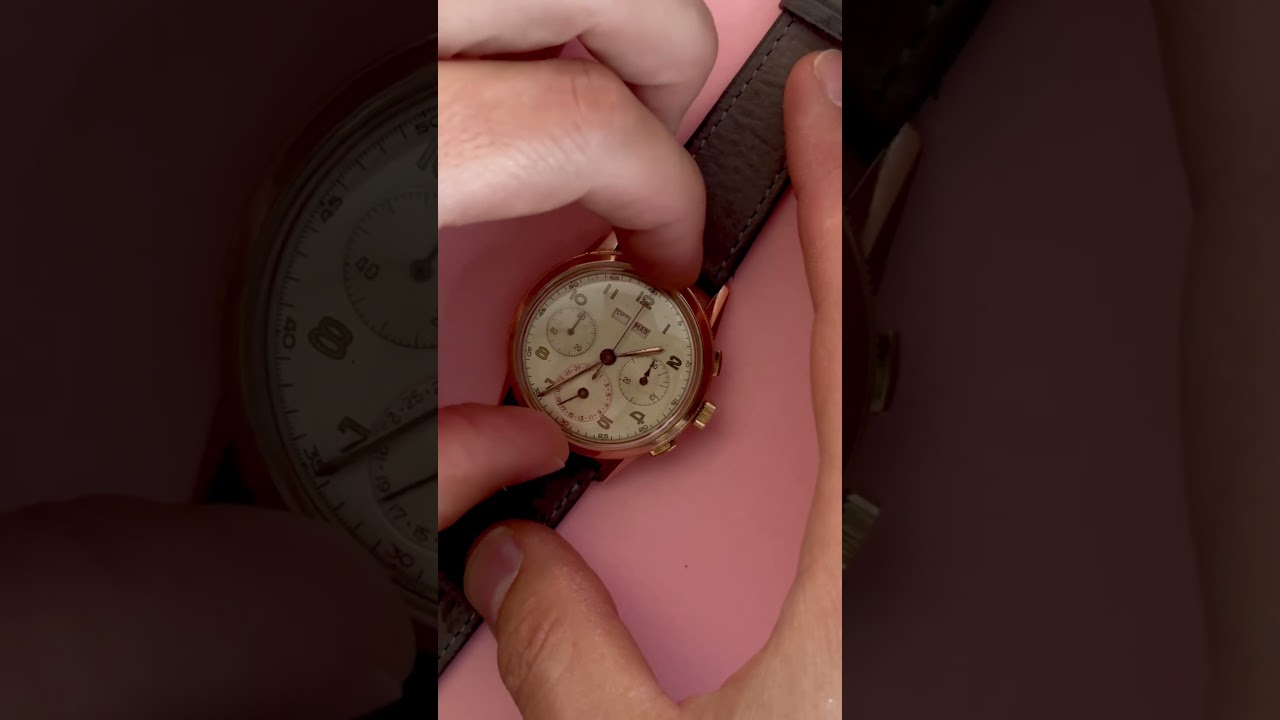 Ik heb hier een volledig 18K roségouden chronograaf met triple calendar en wat hem uniek maakt: de dag, datum en maand stel je in via de draaibare bezel. Geen extra pushers of verborgen correctors… gewoon draaien aan de lunette. Alsof je een vintage prototype van de Rolex Sky-Dweller in handen hebt.
