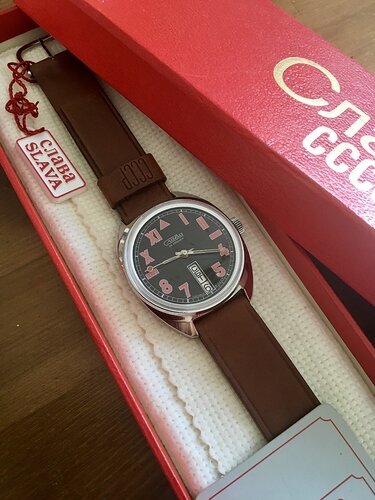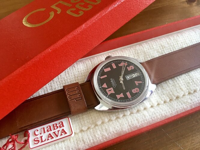 Het gaat in dit geval om een civiel horloge met het ‘Second Moscow Watch Factory’ 2428 uurwerkje, een handopwinder met dag/datum (met speciaal quickset knopje) en uitgevoerd met dubbel veerhuis. Meestal worden deze klokjes als ‘head only’ verkocht (dus zonder doosje en bandje, maar met ‘hang tag’ - typisch Russisch) maar ik viel nogal op deze omdat deze compleet met vintage CCCP doosje, bandje en Italiaans garantiebewijs kwam.