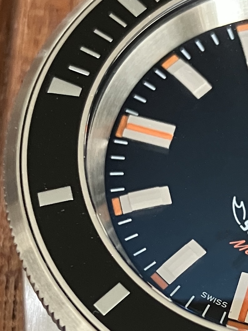 Met opgelegde en ingegoten markers, vertoont de bezel meerdere gezichten tijdens diverse lichtinvallen. De markers variëren van nauwelijks aanwezig tot goed zichtbaar tot zelfs flonkerend in het zonnetje. Onderstaand, ziet u het effect al op diverse plaatsen van de bezel.