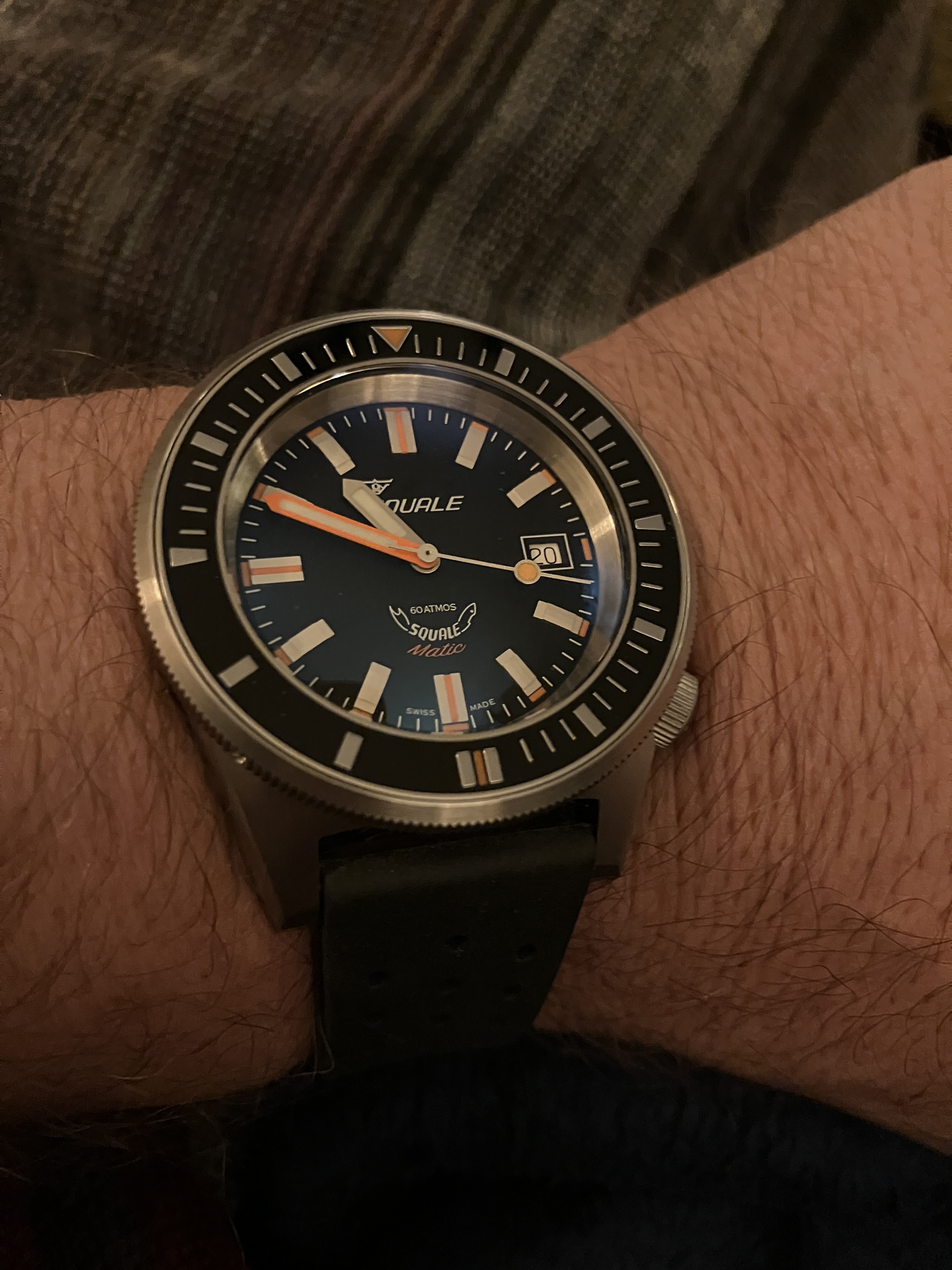 De tropic band, waarop dit horloge wordt geleverd, draagt erg comfortabel maar is toch ook voldoende vormvast. Het rubber heeft tevens exact de juiste hoeveelheid wrijving met mijn pols en die twee factoren samen borgen het, toch wat zwaardere, horloge uitstekend tegen ongewenste bewegingen op mijn pols. Ook hier stelt Squale bepaald niet teleur.
