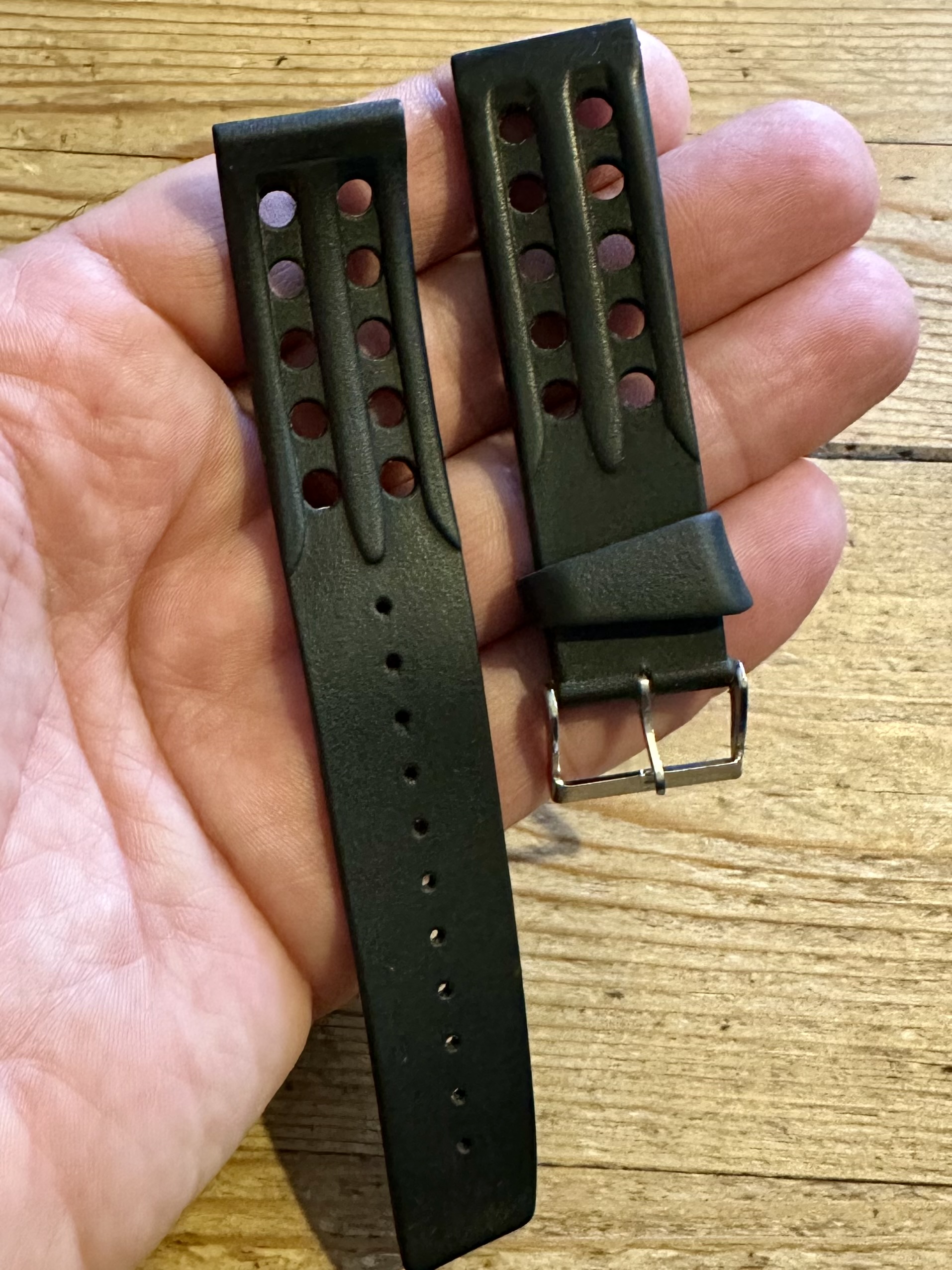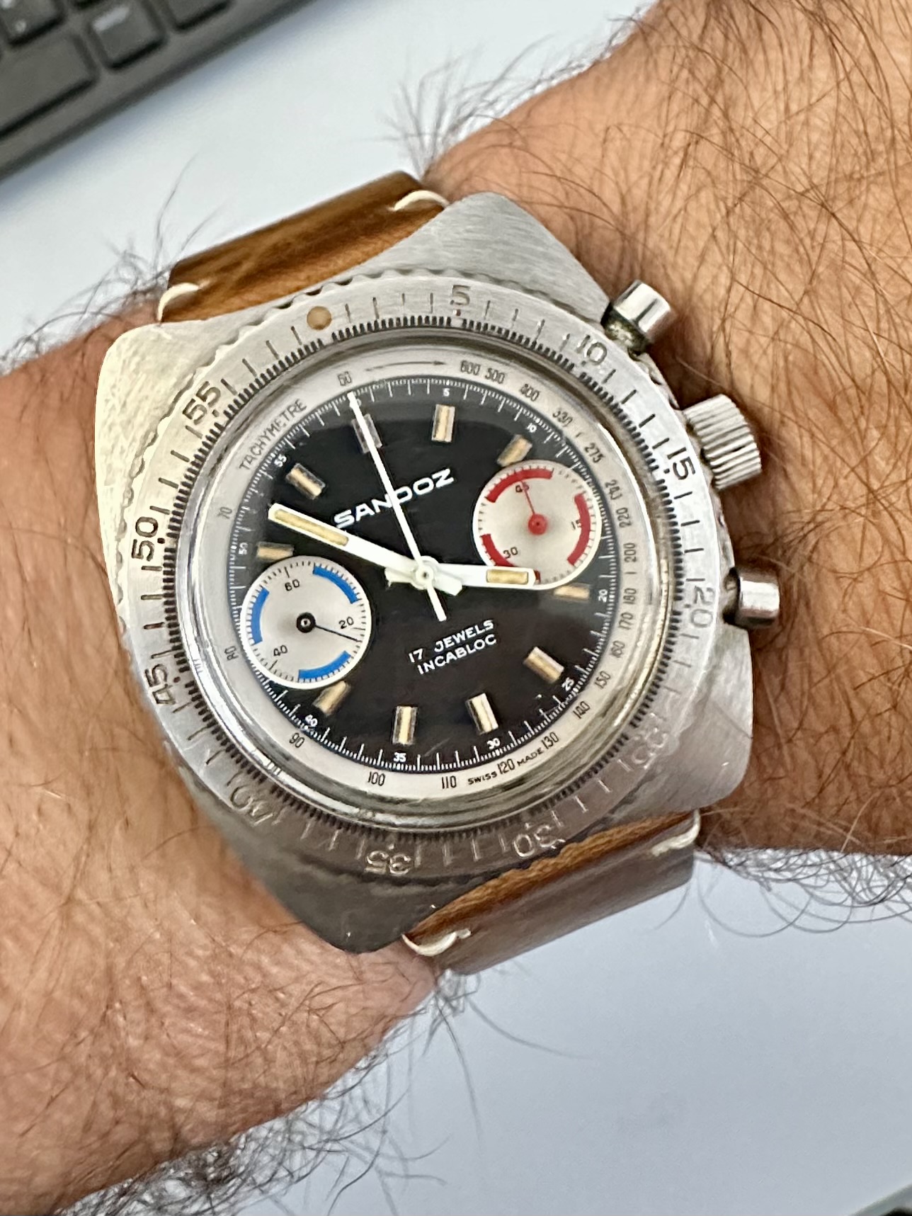 Met zijn 20mm is deze te smal voor de Sandoz, dus ik moet weer op zoek naar een ander, passend horloge (wat een straf)
