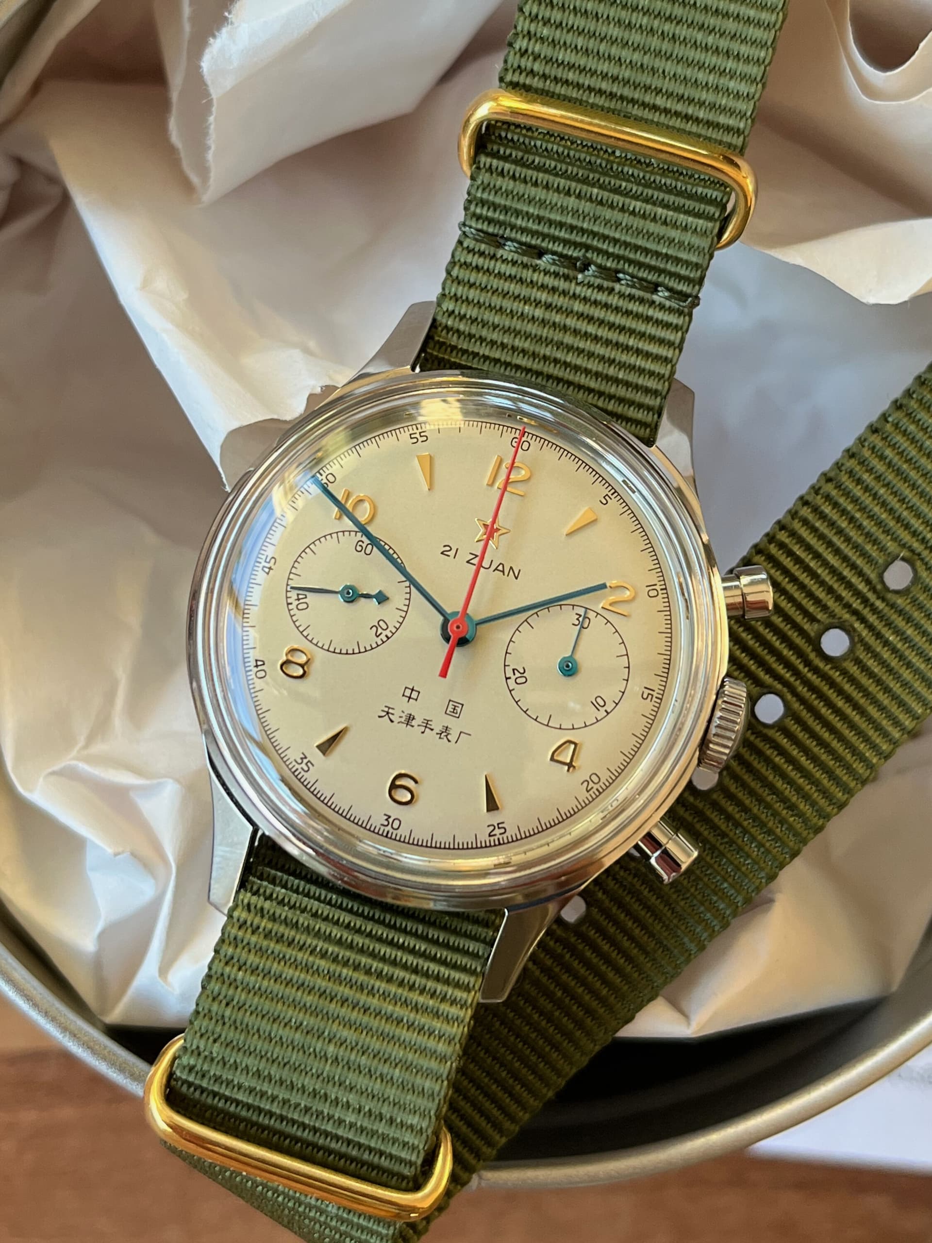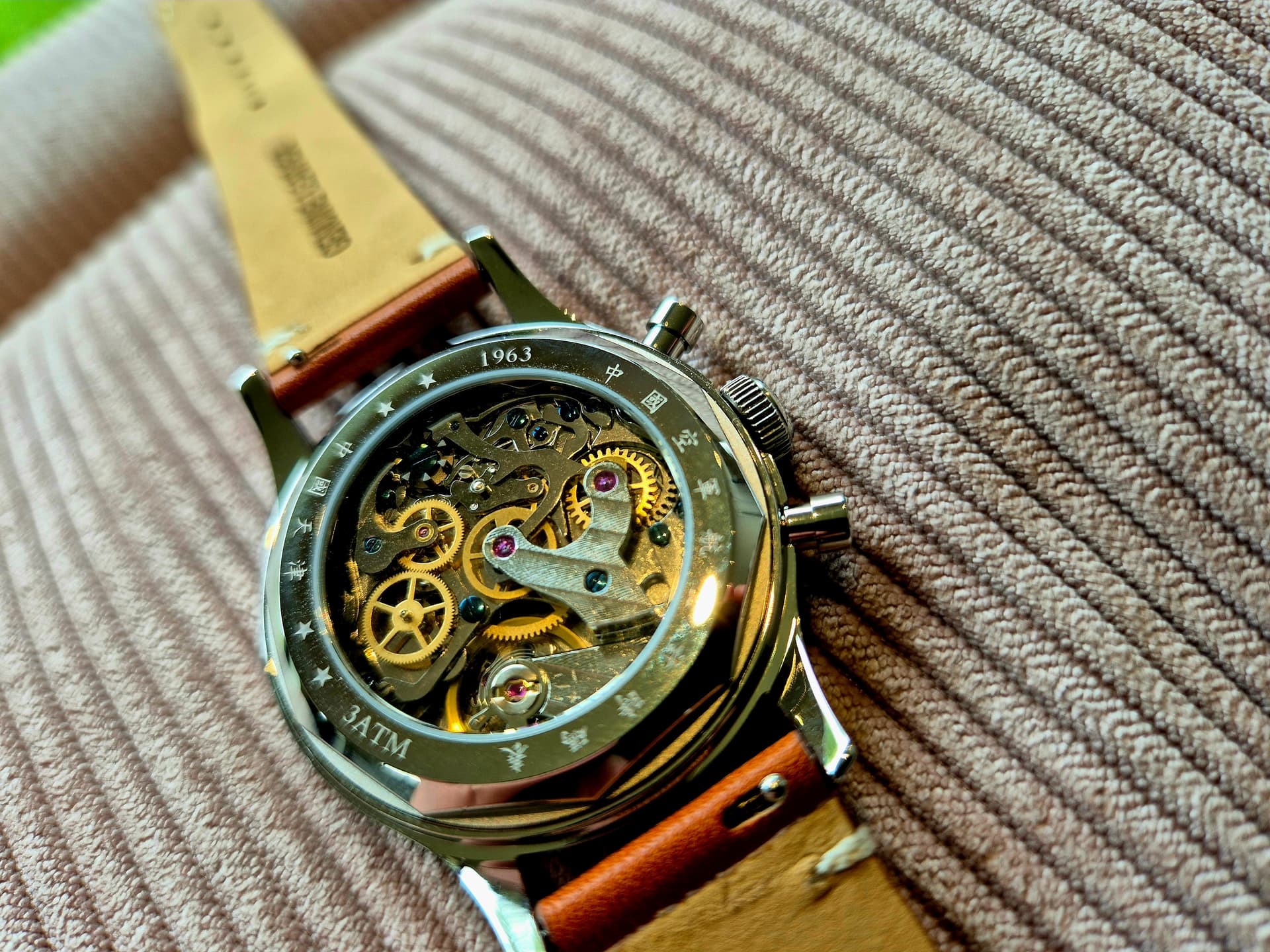 In hun plaats wou ik iets van de Chinees in mijn collectie nemen binnen dezelfde klasse maar met zijn eigen verhaal en eigen geschiedenis die niet op een ander leunt. En dan kom je bijna altijd uit bij de 1963. Eind vorige week een mooie deal gezien en gisteren een safieren 38mm met open achterkant uit de postbus gevist.