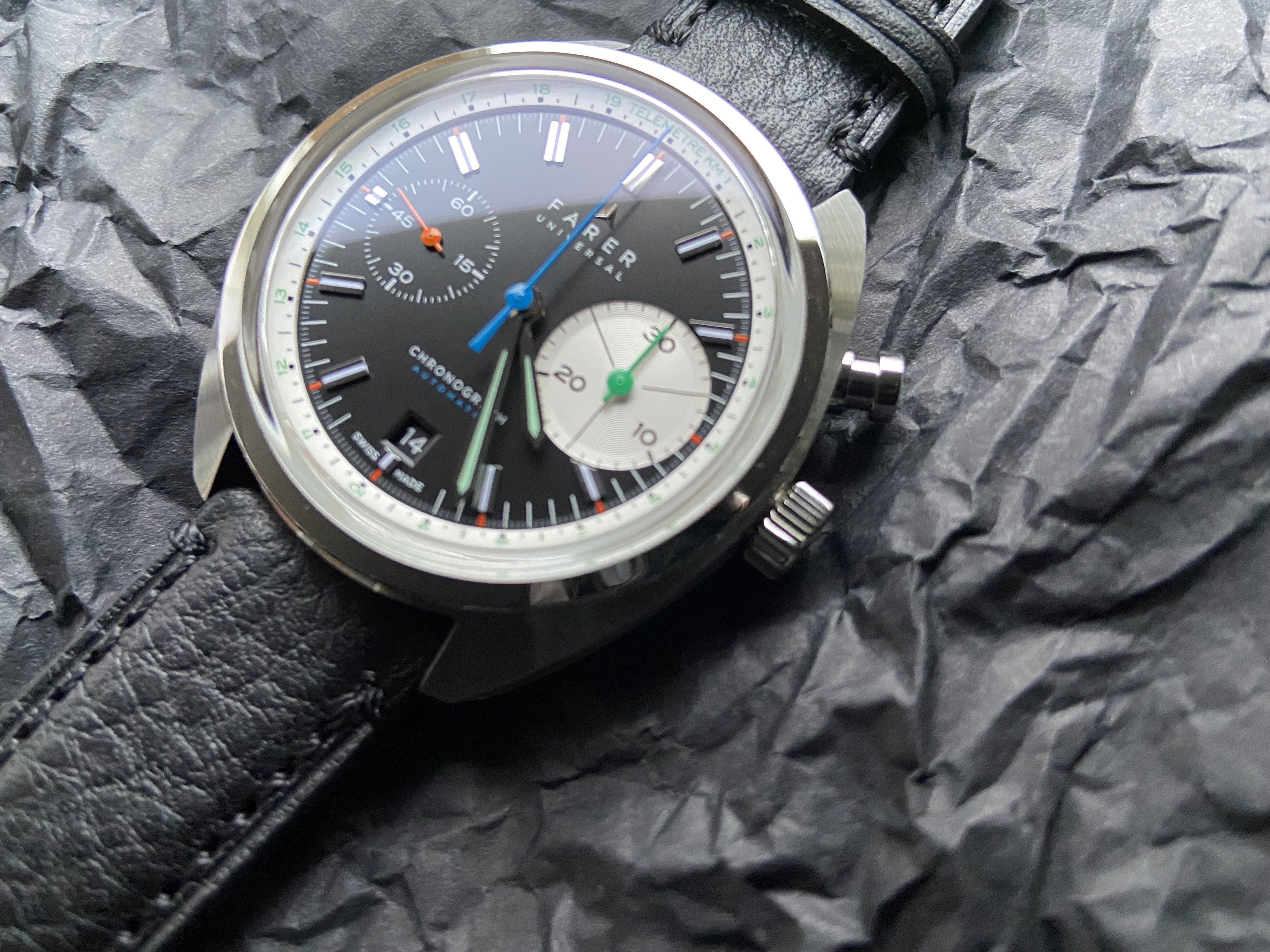 Deze Monopusher van Farer is een geweldige verschijning; op het eerste gezicht een understated chrono door die diep zwarte plaat en de enkele pusher. Maar wat een levendigheid krijg je als bonus door die toevoeging van precies goed gekozen kleuren voor de wijzers en prints op de dial!