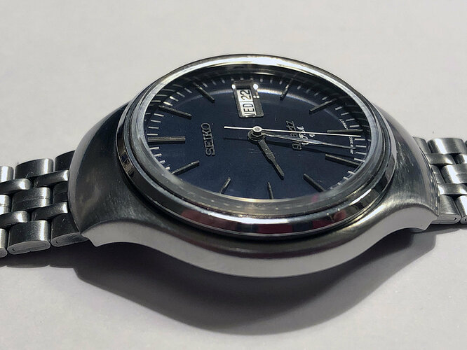 Hij is onlangs nog voorzien van een NOS glaasje, dus dat ziet er fraai uit. De kast kan wel een milde opkanpbeurt gebruiken, dat staat wel op de to-do lijst. Een origineel bandje vinden zal wel een opgave worden, maar misschien is donkerblauw leer ook wel een optie. Een andere vintage Seiko band misschien? De 16mm maat maakt de spoeling wel dun. Voorlopig eerst maar eens van deze kleine kanjer genieten!
