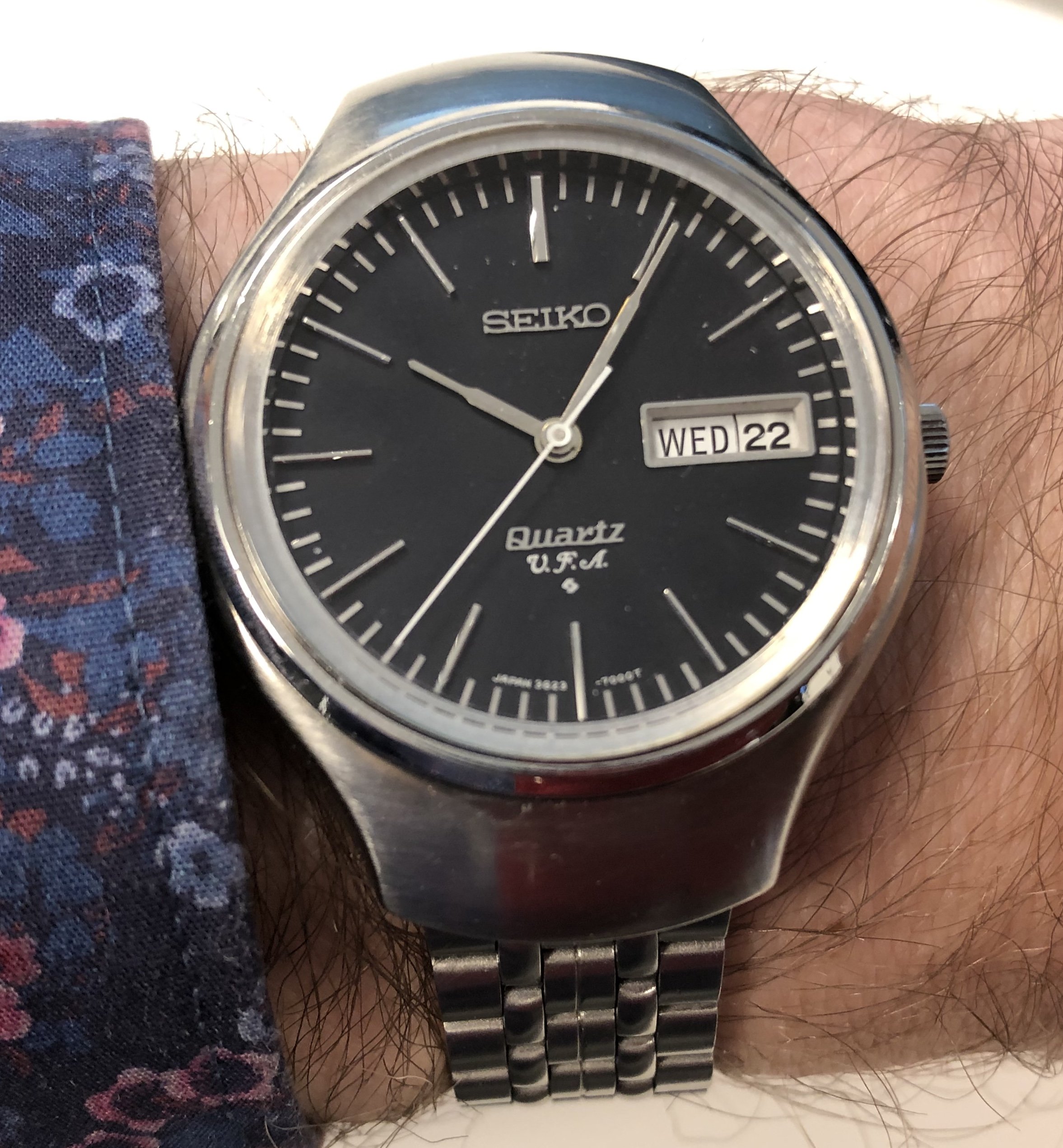 Mijn eerste nieuwe aanwinst sinds mijn aanmelden op het horlogeforum. De vele mooie verhalen en plaatjes hier zorgen wel voor een gezonde (?) horlogekooplust. Een tweede is wanneer er horloges bij de horlogemaker zijn die ik veel draag. Dat gemis mag ik graag goedmaken met een nieuwe aanwinst. Deze keer een vintage Seiko Quartz.