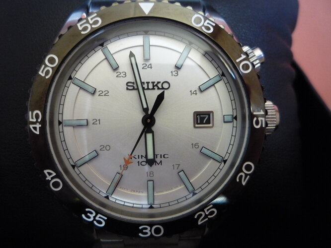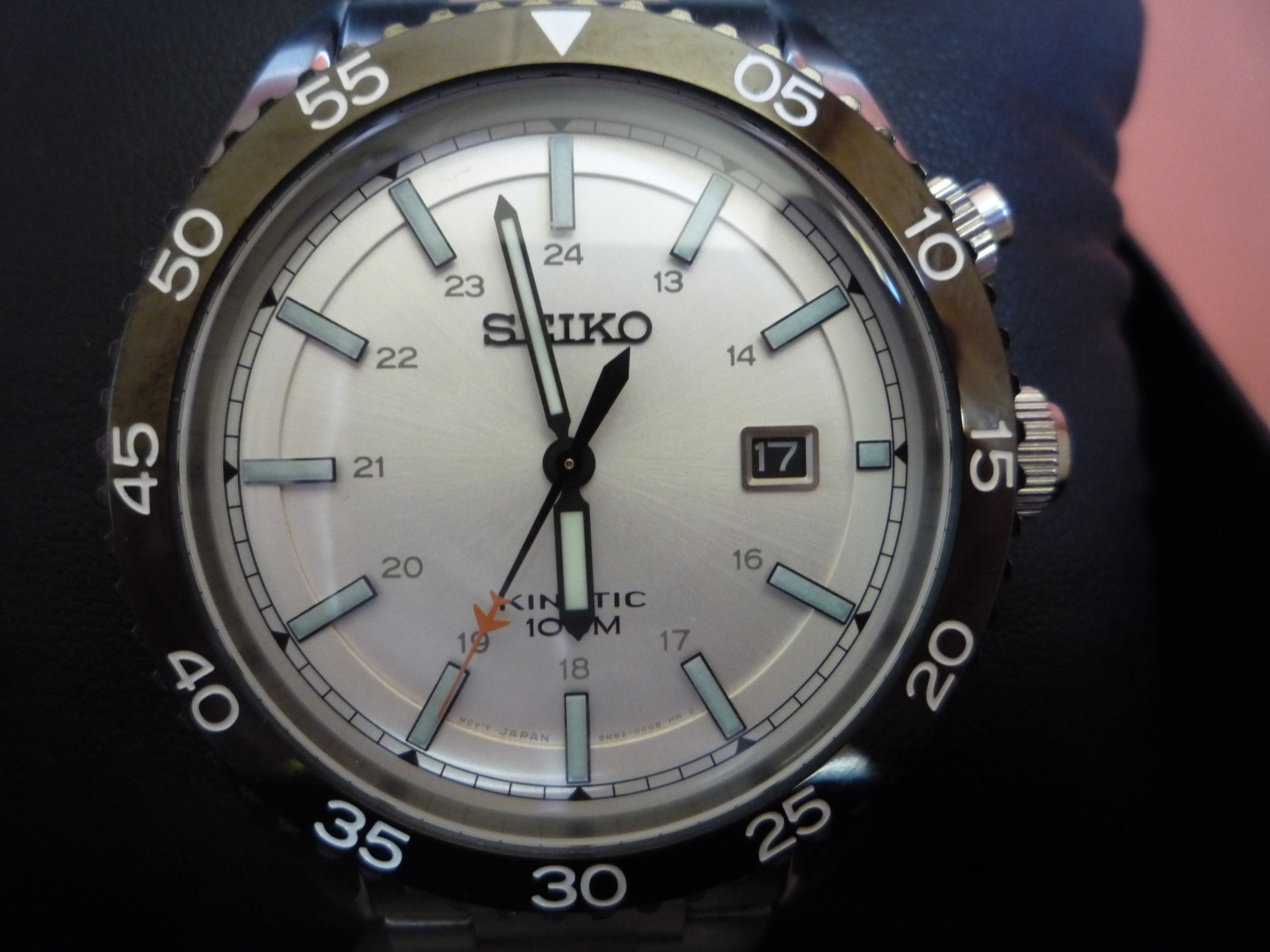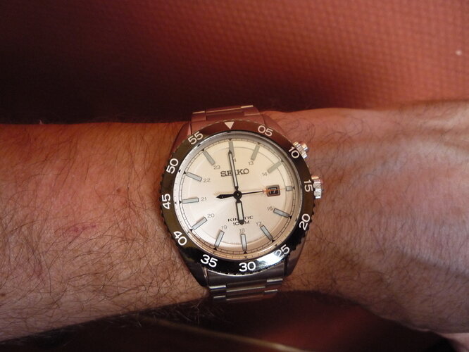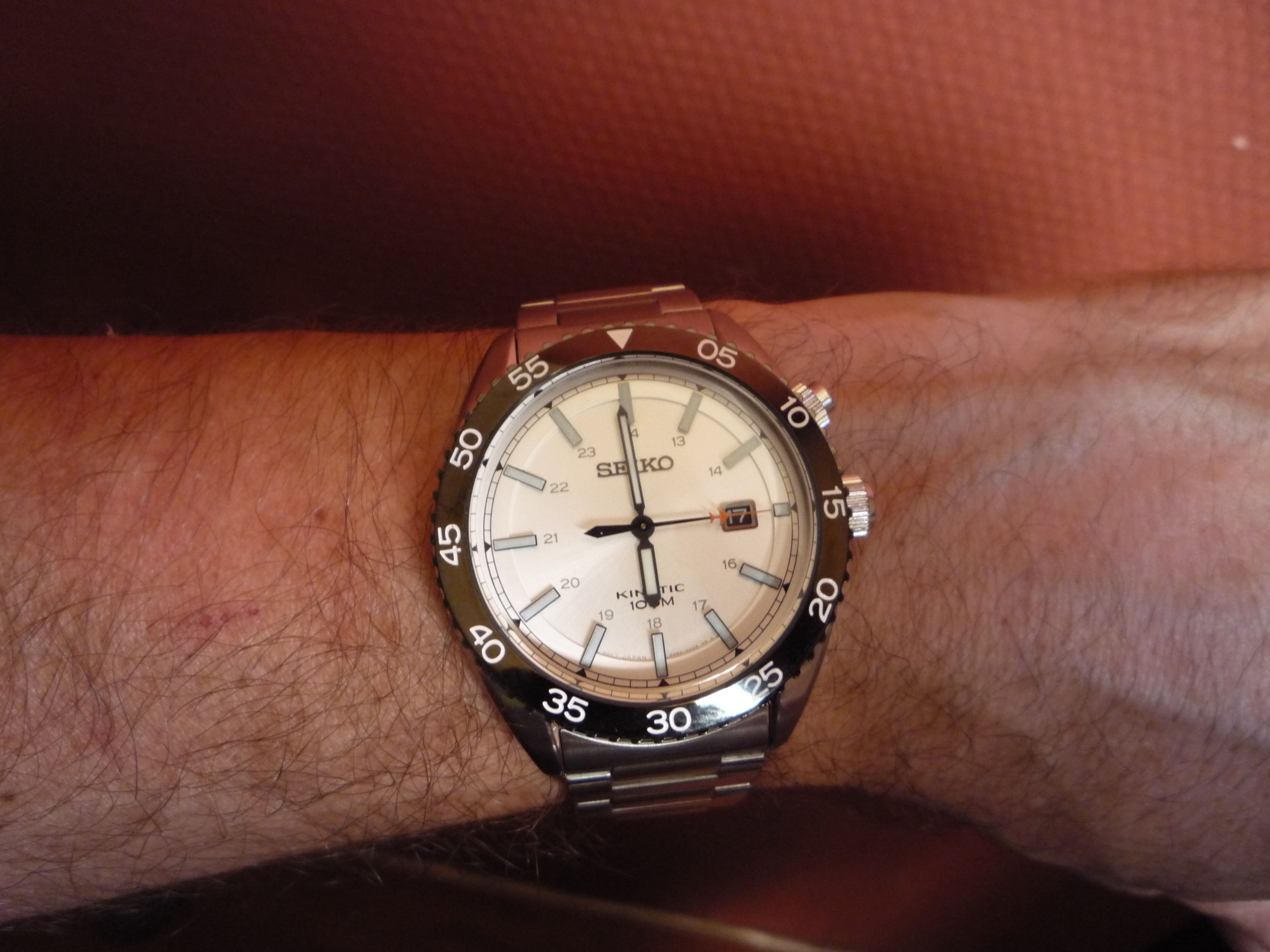 Ik wilde in mijn collectie(als ik het zo mag noemen) zeker een keer een seiko kinetic hebben. Mijn voorkeur gaat uit naar horloges van het grotere formaat. 41 tot 45 mm of zo iets. Met uitzondering van de G-shock uiteraard. De voorkeur ging nu naar een witte dial. deze had ik nog niet.